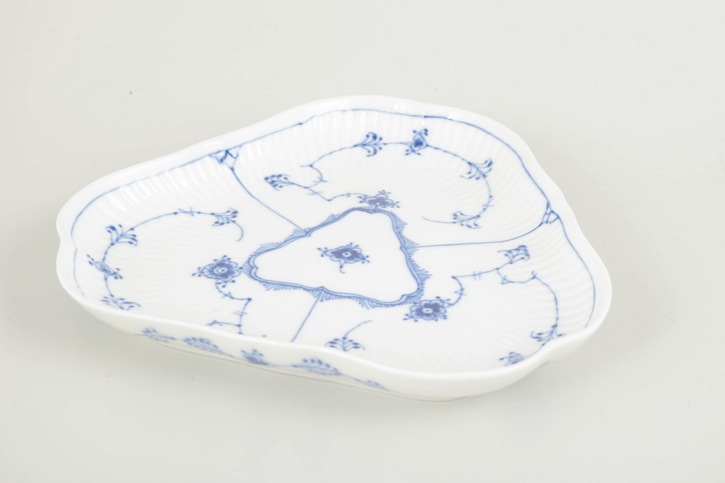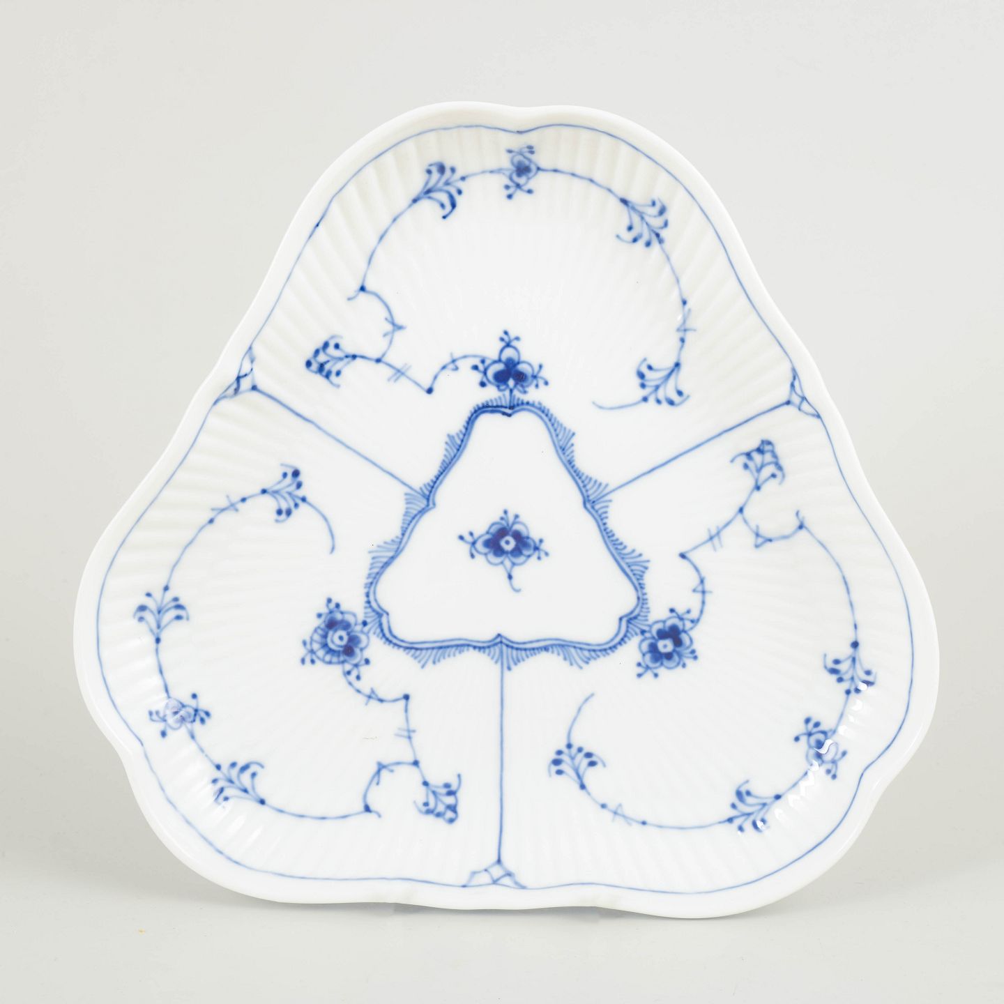 Royal Copenhagen Musselmalet Riflet trekantet fad, 1965.Karakteristisk trekantet fad i Musselmalet Riflet, udført i klassisk riflet form og dekoreret med håndmalet koboltblå underglasur. Fadet er opdelt i tre felter med centralt trekantet spejl og fremstår som en markant og relativt sjældent forekommende serveringsmodel i stellet.