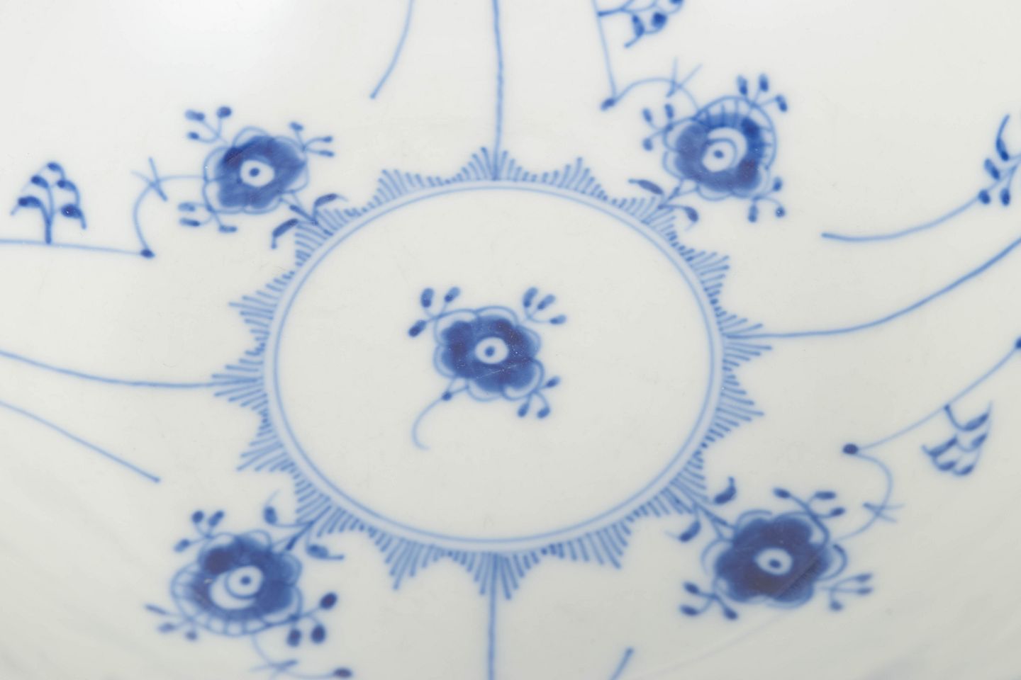 Royal Copenhagen Musselmalet Riflet skål, 1963.Sjælden skål i Musselmalet Riflet, udført i klassisk riflet form og dekoreret med håndmalet koboltblå underglasur. Skålen har en let bølget rand og fremstår som en mindre almindelig model inden for stellet, velegnet både til servering og som dekorativ del på bordet.