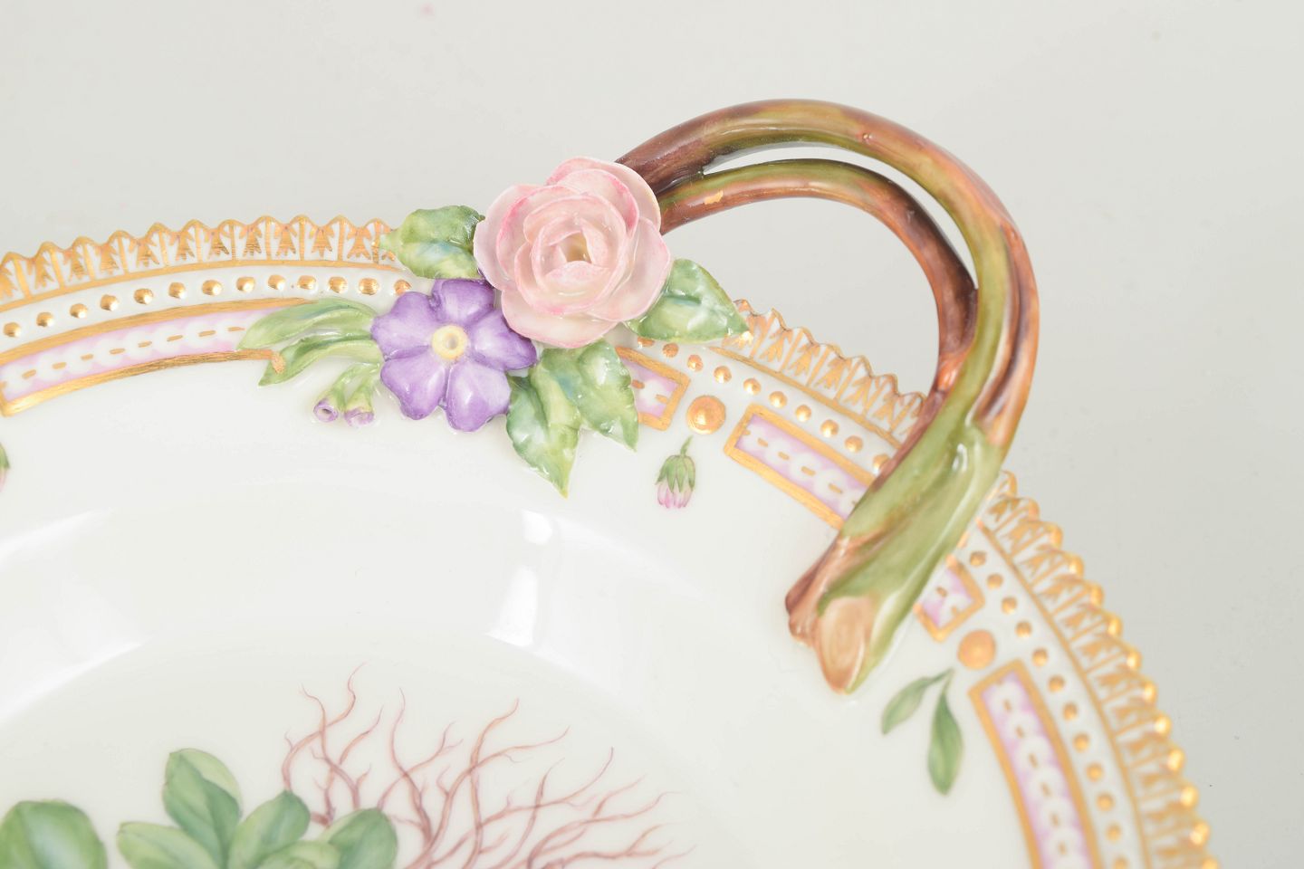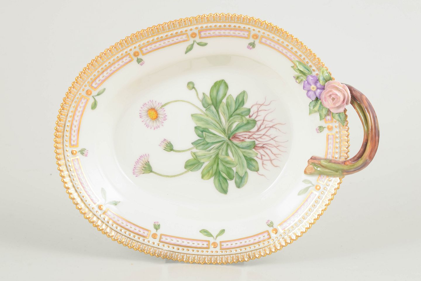 Royal Copenhagen Flora Danica fad med hank, slutningen af 1970’erne.Elegant fad med hank i det ikoniske Flora Danica-stel, håndmalet med botanisk motiv gengivet efter Flora Danica-værket. Fadet er udført i stellets karakteristiske, raffinerede formsprog med dekoreret rand og markant hank, der giver både funktionalitet og et dekorativt udtryk. Velegnet til servering eller præsentation.