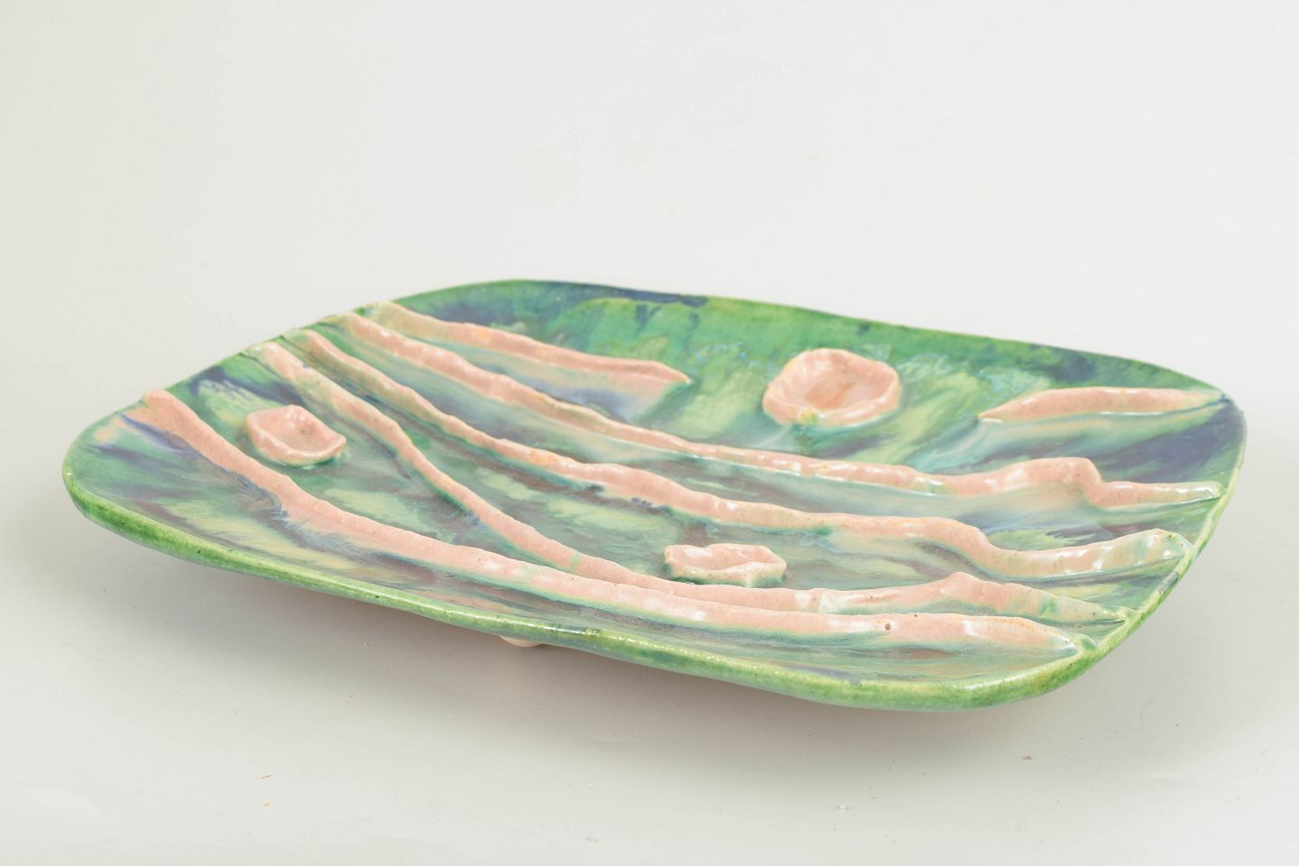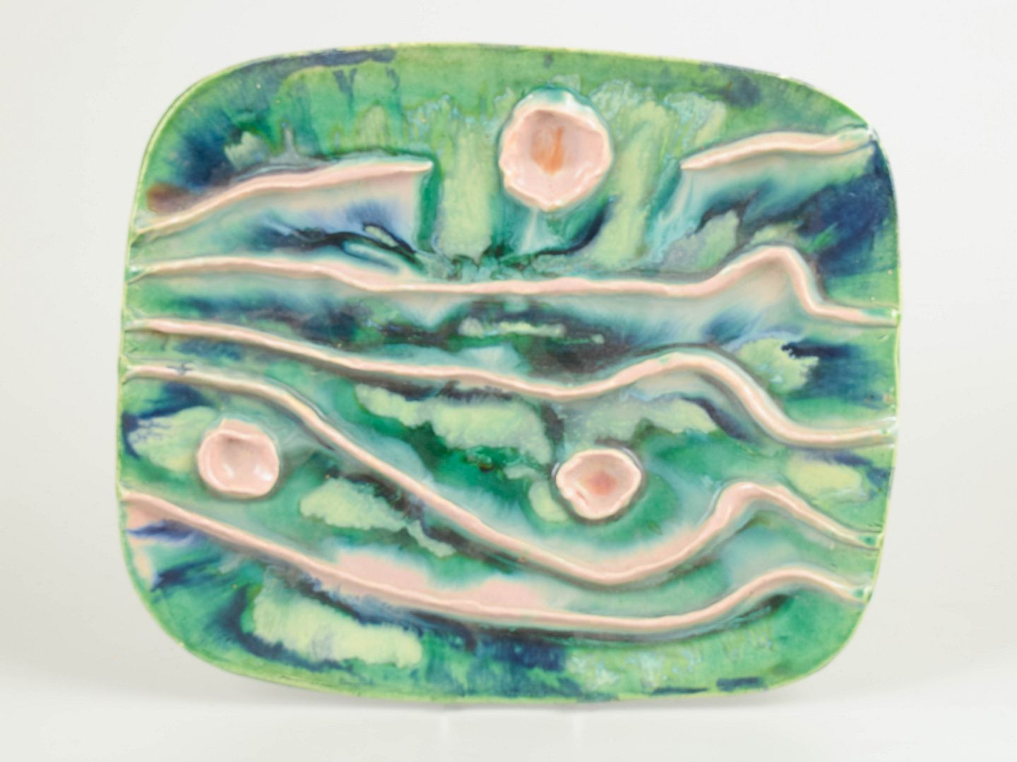 Leszek Dutka (1921-2014) Organisk relief, 1972. Signeret.Unikt, væghængt keramisk relief udført i organiske former med markant reliefvirkning. Overfladen er rigt modelleret med bølgende linjer og forhøjede partier, dekoreret med levende glasurer i grønne og blå nuancer, kontrasteret af bløde, lyserøde reliefelementer. Et ekspressivt og sanseligt værk, der tydeligt afspejler 1970’ernes eksperimenterende keramiske udtryk.