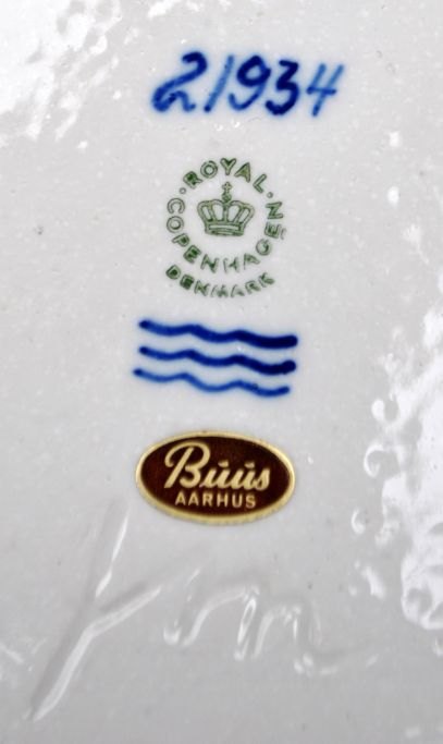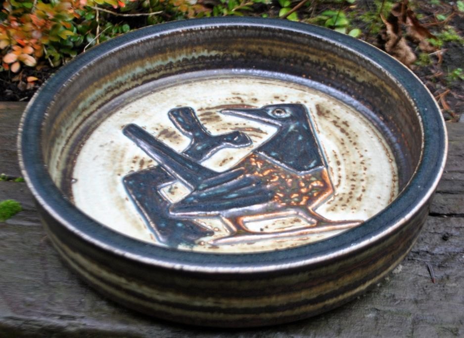 Mogensen, Jørgen (1927 - ) Danmark: Stort fad. 21.934. Dekoration i form af fugl og en gren. Udført i stentøj for Royal Copenhagen. Med sung glasur. Dia.: 31,5 cm. H.: 7 cm.Perfekt stand!