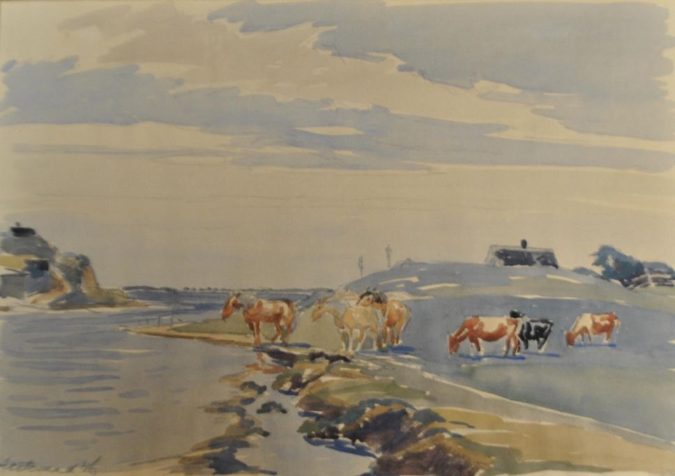 Svendsen, Albert (1889 - 1959) Danmark: Heste og køer ved en fjord. Akvarel. Signeret 1946. 28 x 40 cm.Uindrammet.
