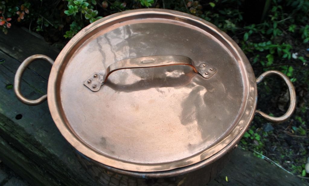 Stor antik kobbergryde med håndtag og låg, 19. årh. Låget stemplet. Indvendig fortinnet. H.: 32 cm. Dia.: 33 cm.Emne nummer: 28563