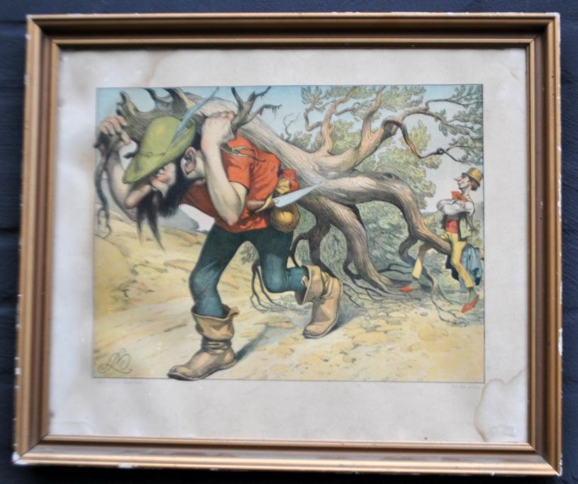 Moe, Louis (1877 - 1945) Danmark: Kompostion med mand, der bærer et træ. Farvelitografi. Signeret i trykket. Udgivet af Alfred Jacobsen, København. 27,5 x 36 cm.Indrammet: 41 x 49 cm.