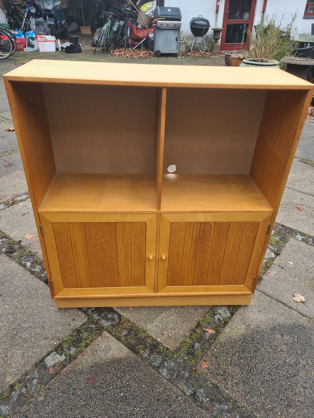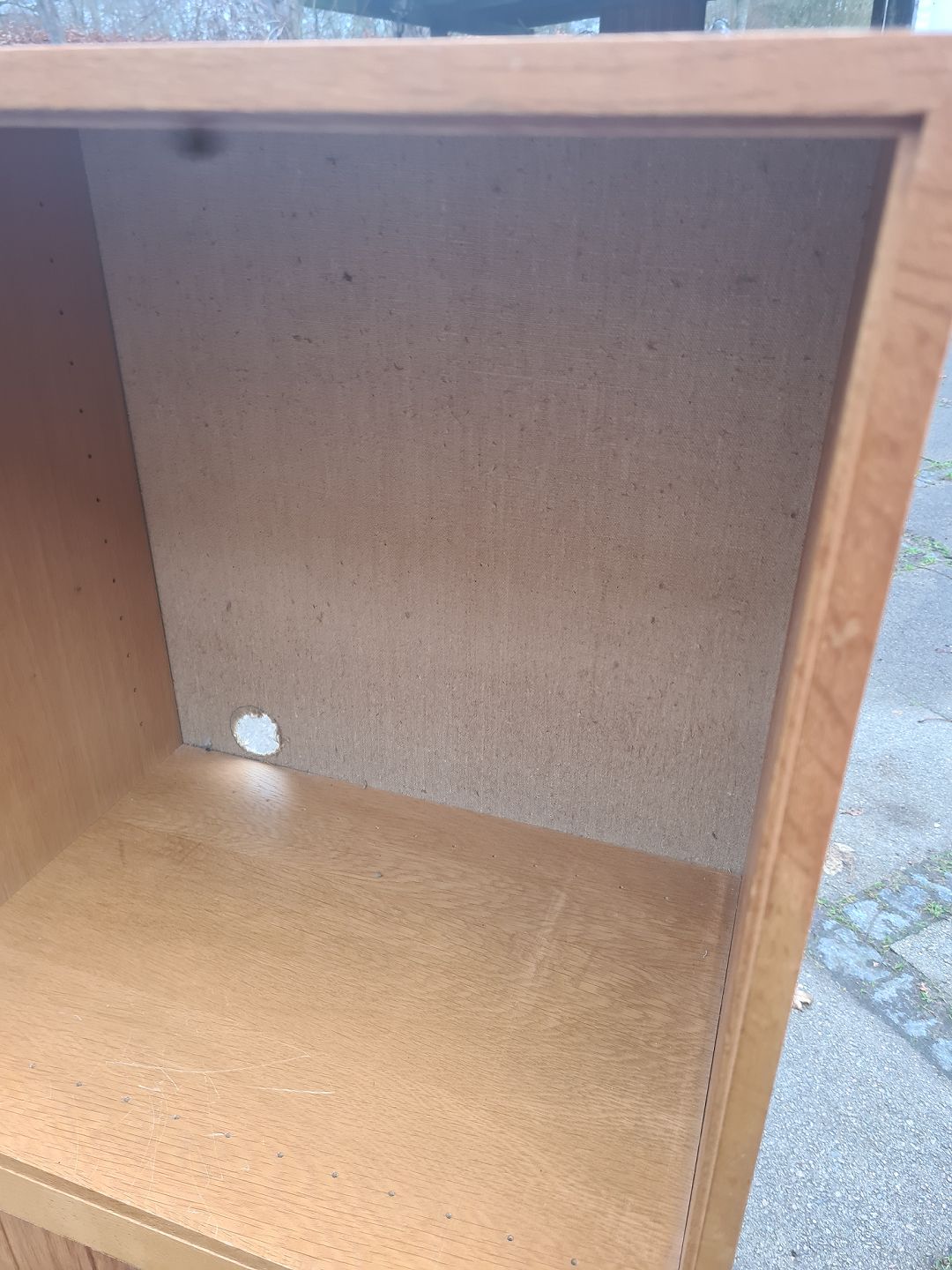 Reol i finéret eg med underskab og hessian beklædt bagbeklædning. Ydført hos HG Funiture i 1970'erne. Fremstår pæn og velholdt uden de store brugsspor dog med hul i bagbeklædningen.(Billede)