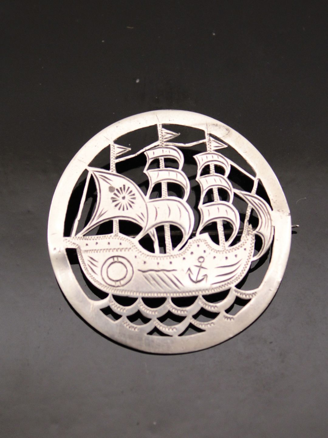 835 sølv broche D. 4 cm. med skib stempler 835s emne nr. 628619 Udstiller