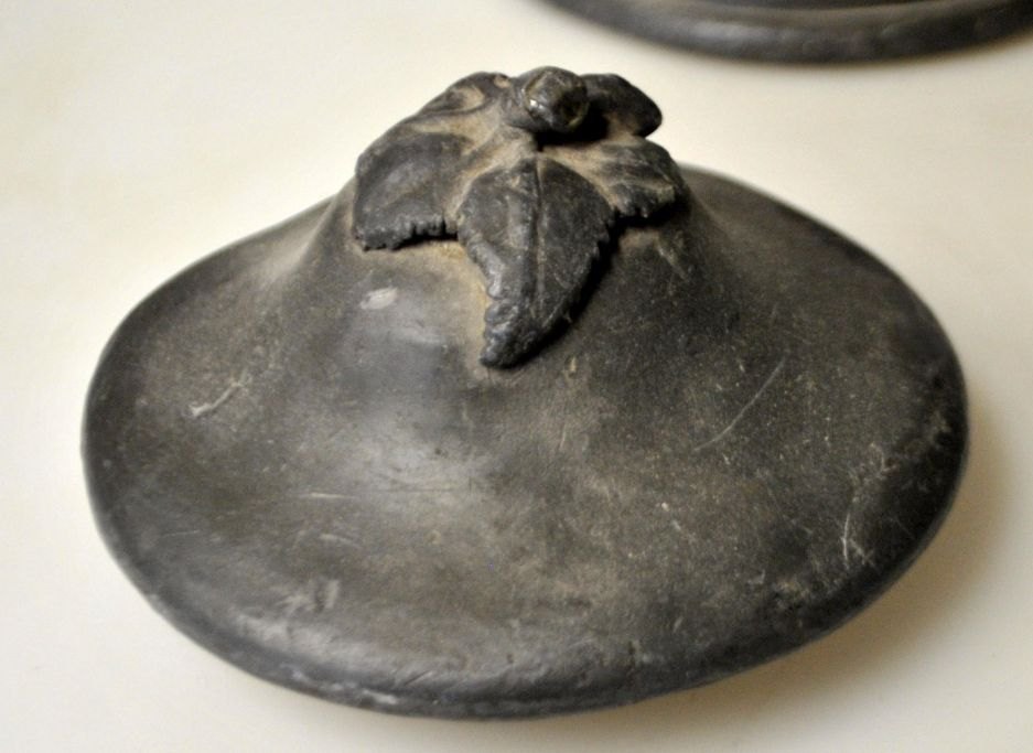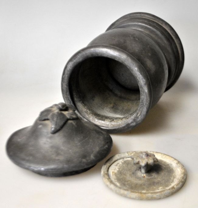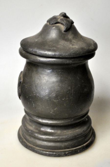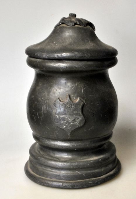 Barok tin tobaksbeholder, 18. årh. Med våbenskjold på siden. Indvendig med vægt. Låg med bladværk. H: 18 cm.Emne nummer: 28606