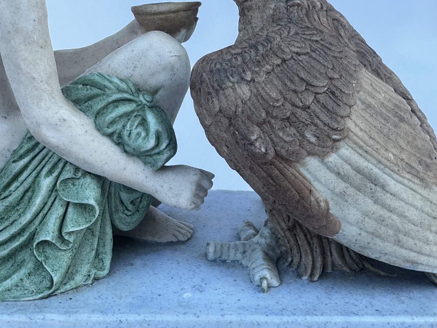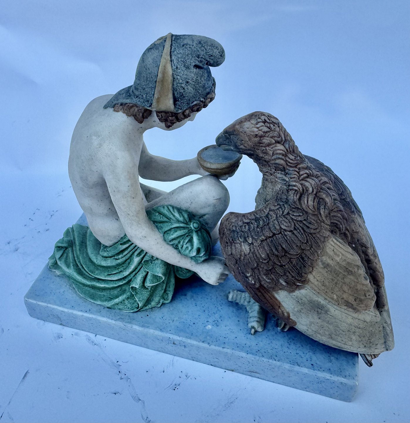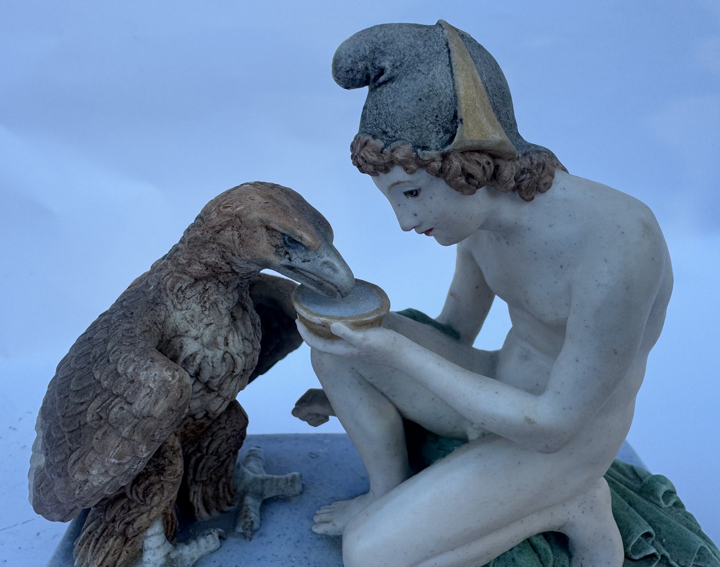 Figur i bemalet bisquit porcelæn forestillende Ganymedes med Jupiter’s (Zeus’ i følge den græske mytologi) ørn af Bertel Thorvaldsen (1770-1844) Formgivet i Rom 1817-18. Denne reproduktion er fra Royal Copenhagen fremstillet i slutningen af 19. århundrede. Ifølge den græske mytologi bortfører Zeus’ (Jupiter) ørn Ganymedes for at for at gøre ham til gudernes mundskænk (tjener). Fabriksmærket på bunden med fabrikkens velkendte tre blå bølger. Figuren mangler Ganymedes’ kande i højre hånd, ligesom der er et mindre afslag på ørnens hale. Mål: H. 11 cm. Basen måler 6 x 12,5 cm.Denne bemalede udgave skulle angiveligt, sammen med andre af Thorvaldsens hvide Bisquit figurer, været udstillet på den store Verdensudstilling i Paris i 1900.