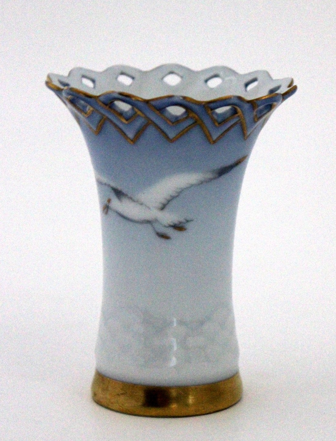 Bing & Grøndahl, Måge med guld, Kuvertvase med hulkant. Nr. 171. Højde 7,5 cm. Øverste diameter 6 cm. I. sortering. Pris: 175 kr. stk. Lager: 1 Udstiller