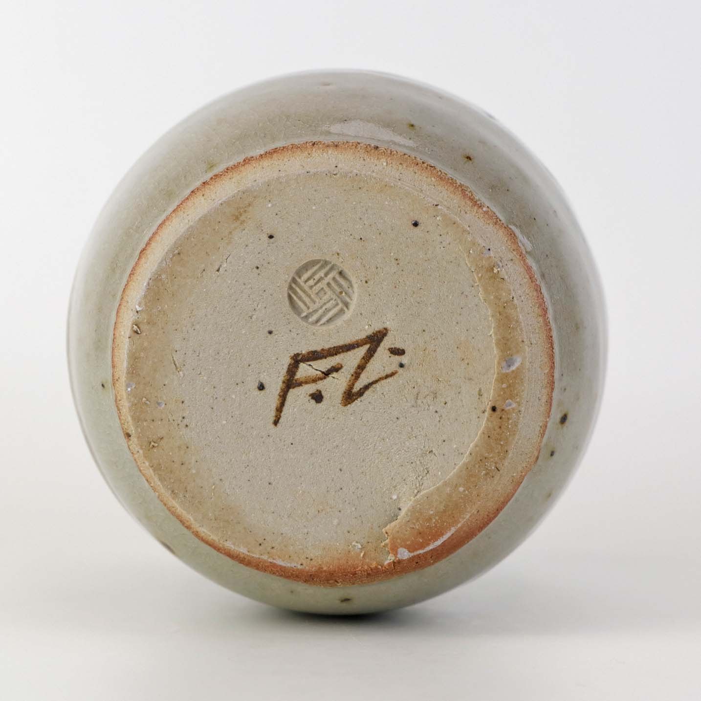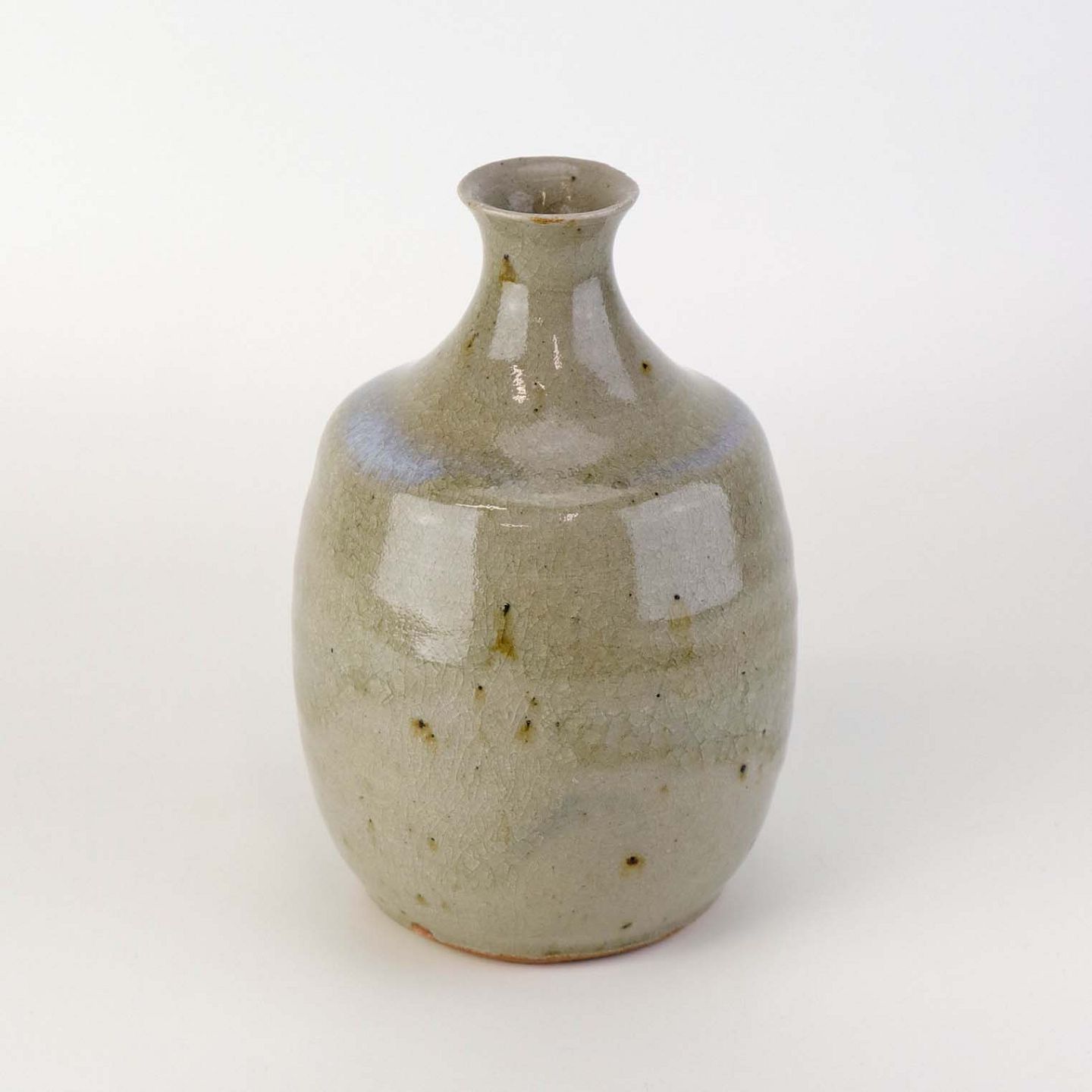 Vase i stentøj med beigefarvet glasur med mørke nister og krakkeleringer samt med en fremhævet blå kant.Producent Finn Lynggaard