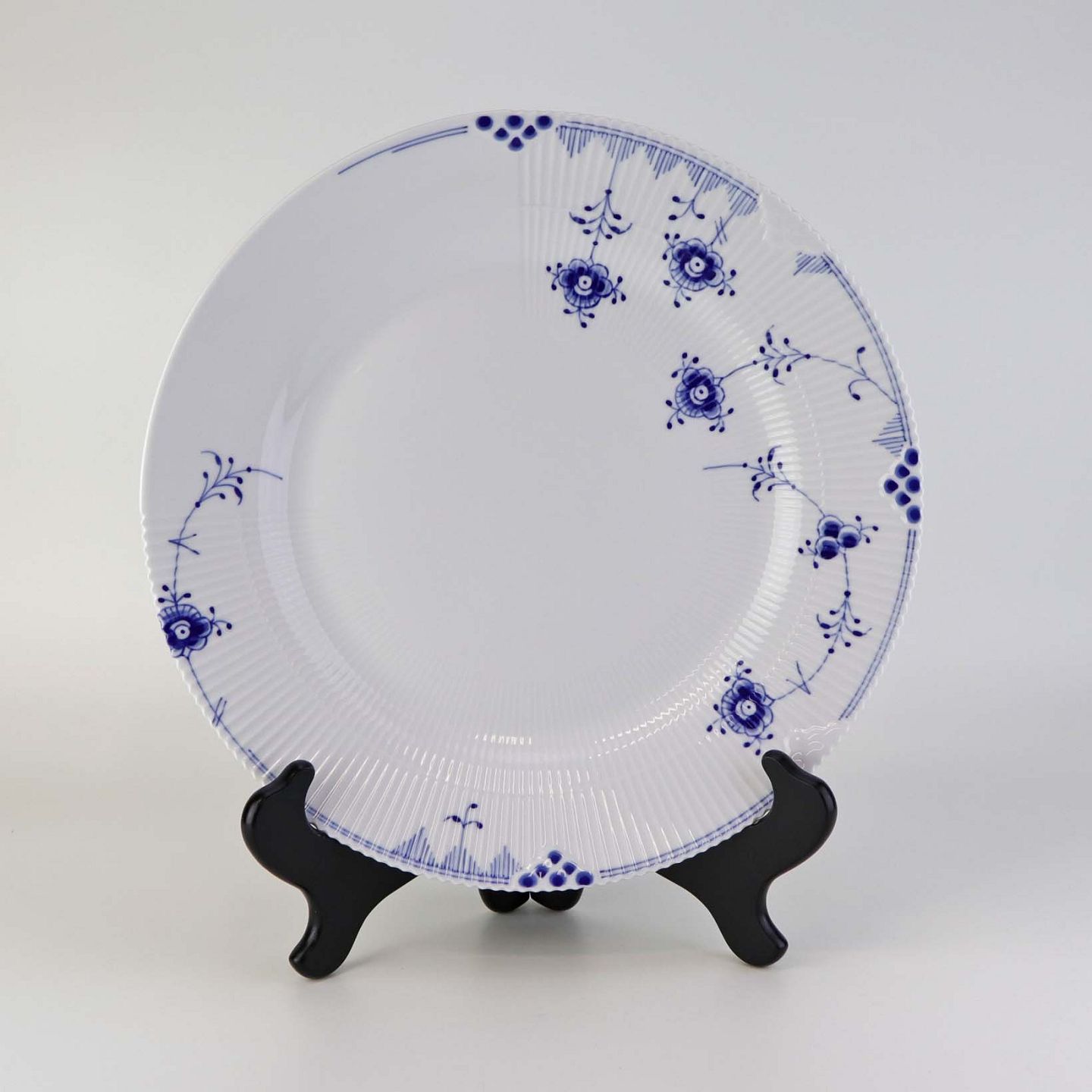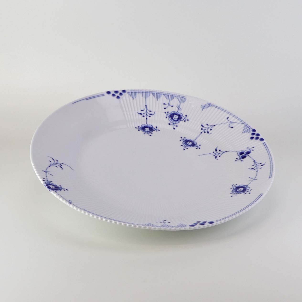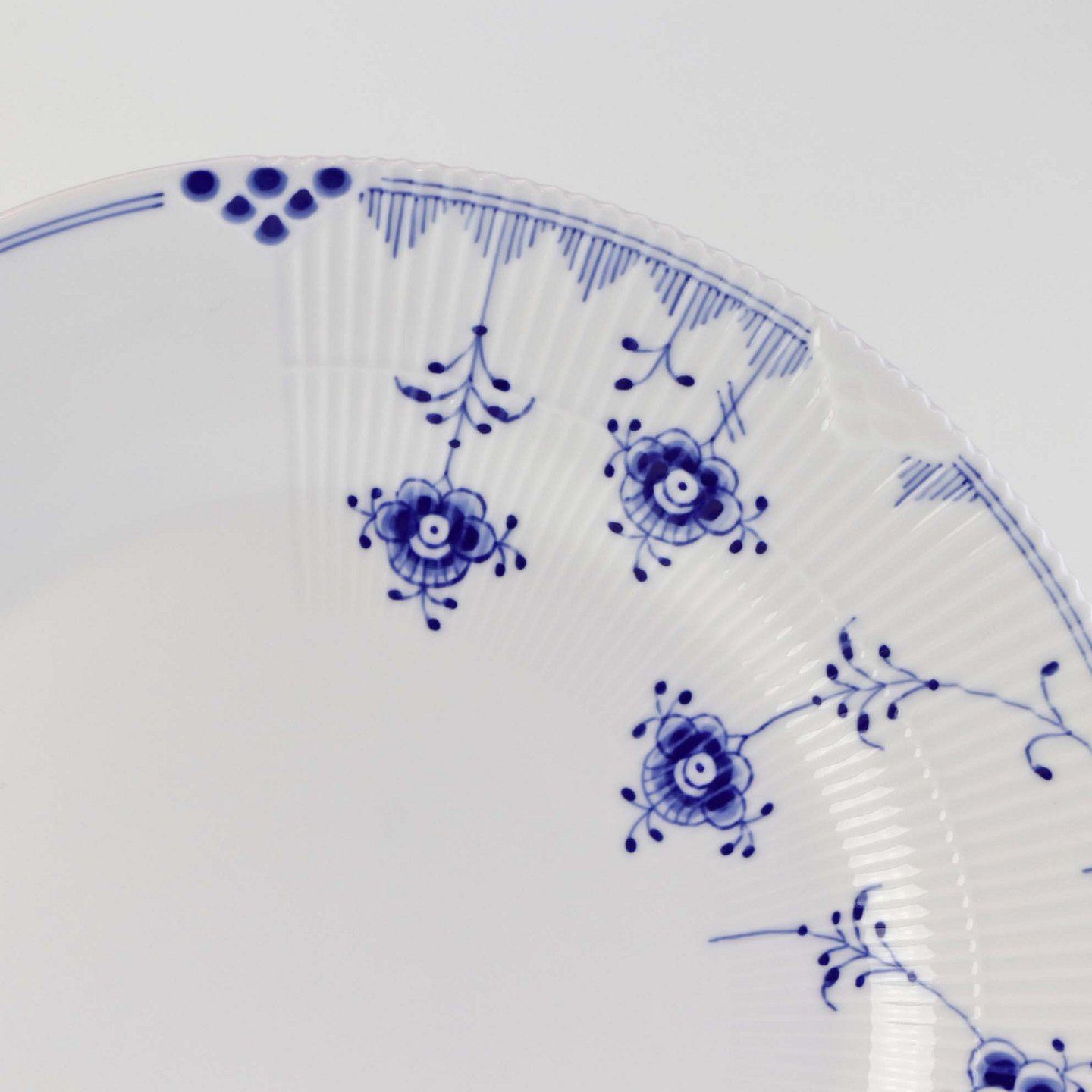 Service i glat porcelæn med let riflet kant og blå dekoration