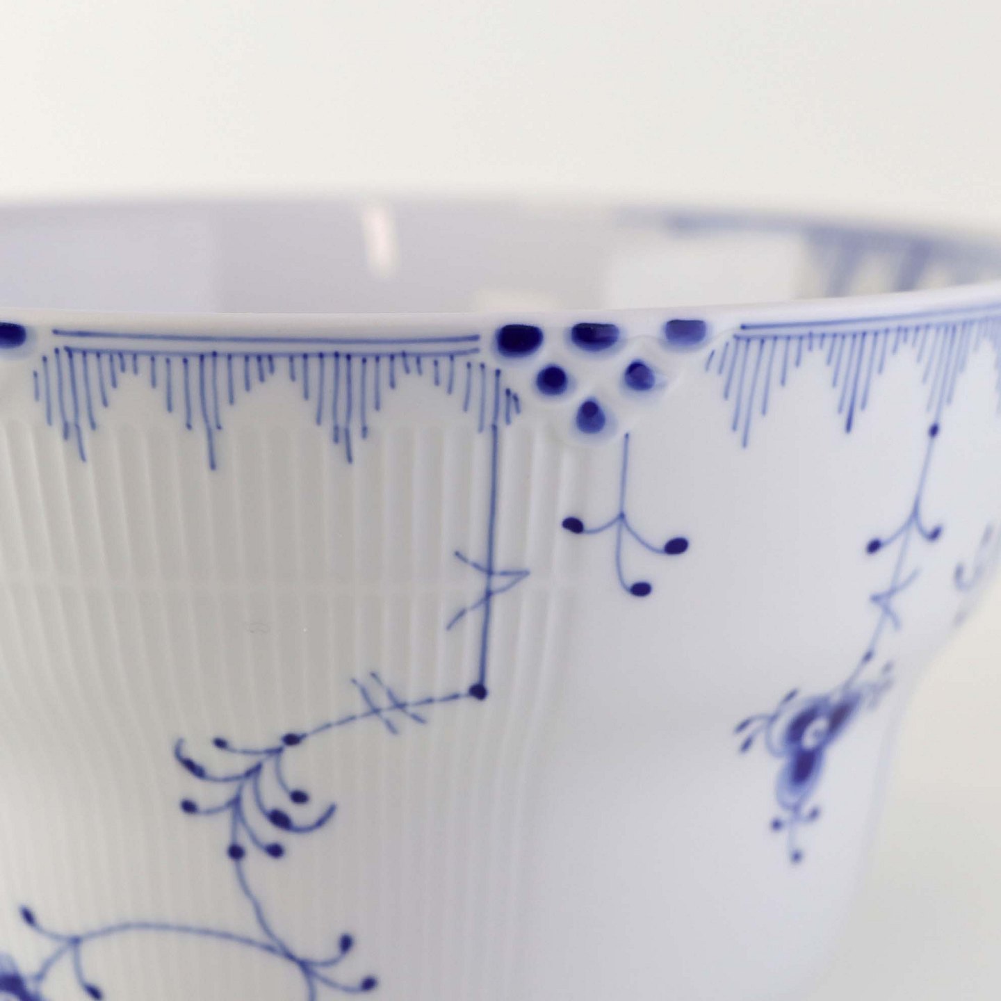 Service i glat porcelæn med let riflet kant og blå dekoration