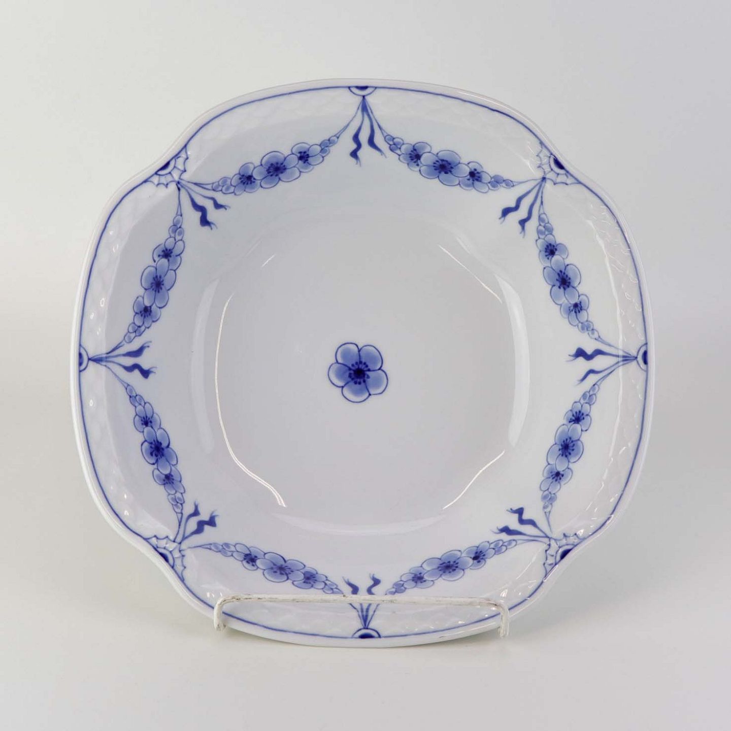 Service i hvidt porcelæn med skelform og motiv af guirlander med blå blomster