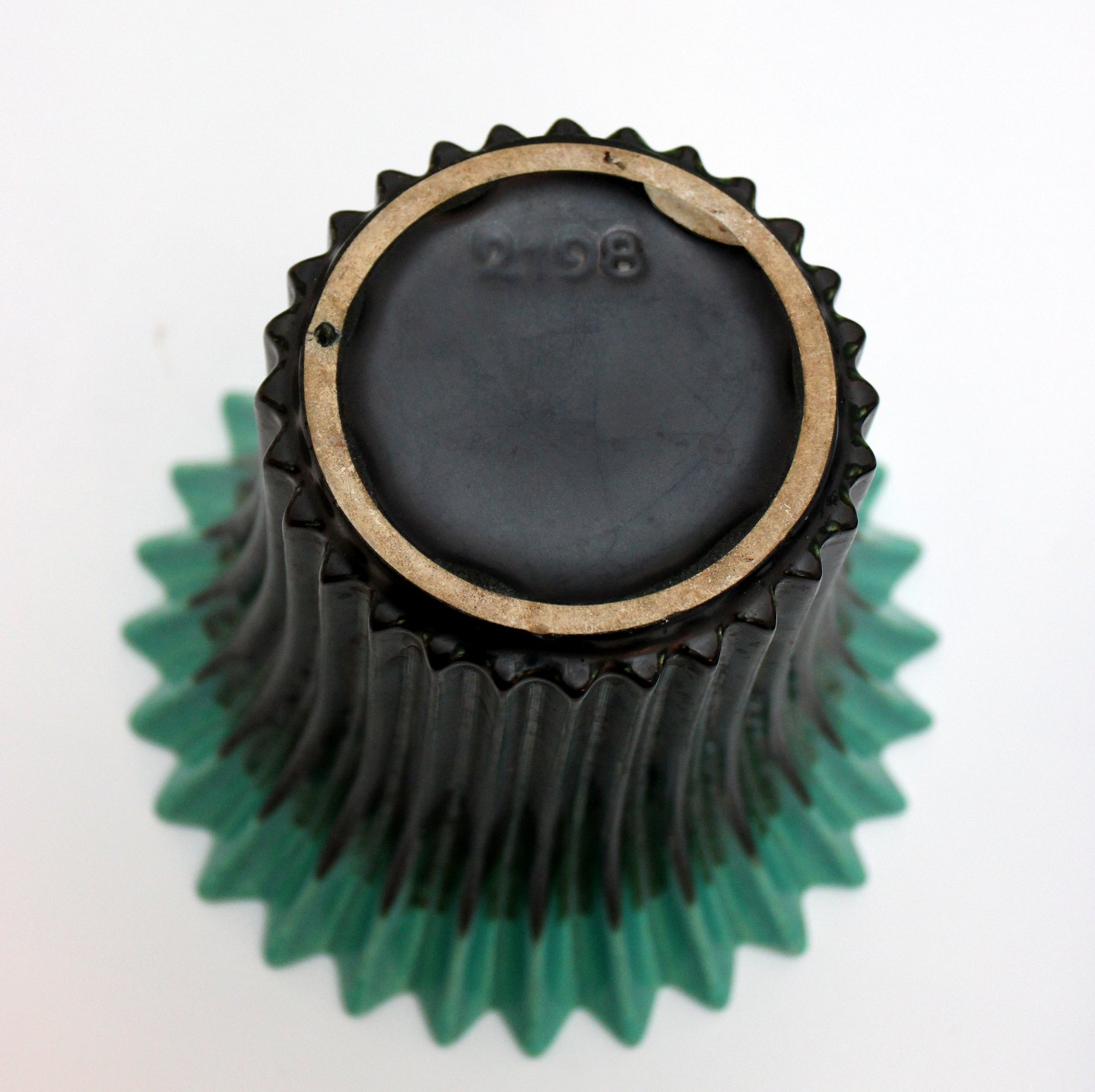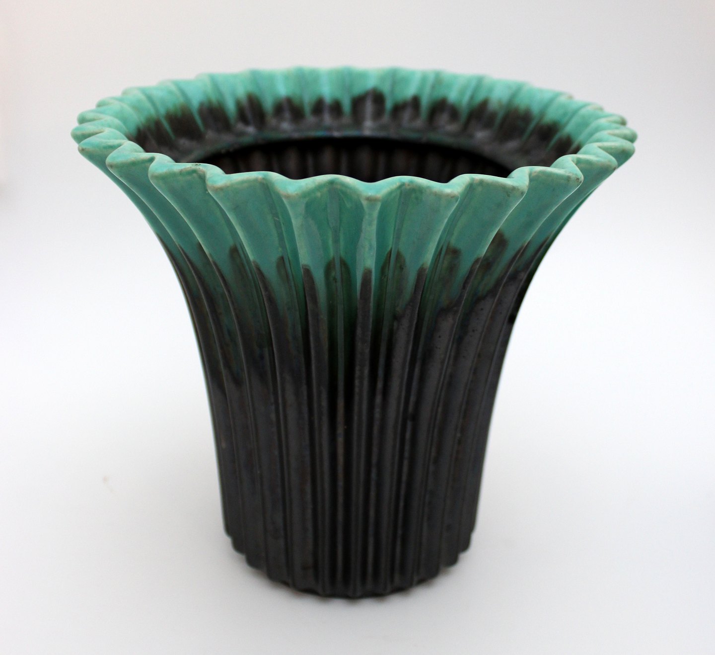 Sort rillet keramik vase med turkis kant. Nr. 2198. Kender ikke keramikeren eller fabrikken. Men vasen er meget dekorativ og anvendelig. Fin stand, bred kalkagtig rand indvendig. Højde 17,5 cm. Øverste diameter 19,5 cm. Nederste diameter 10 cm. Pris: 375 kr. Lager: 1 Udstiller