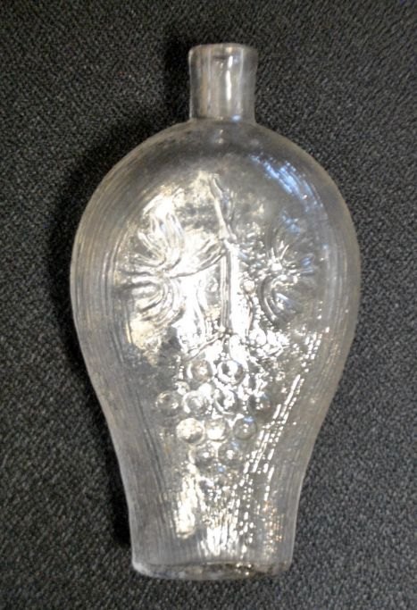 Svensk lommelærke med riller, 19. årh. Klar glas. Med svensk våbenskjold og motiv af vinklase. L: 14,5 cm.Emne nummer: 28684