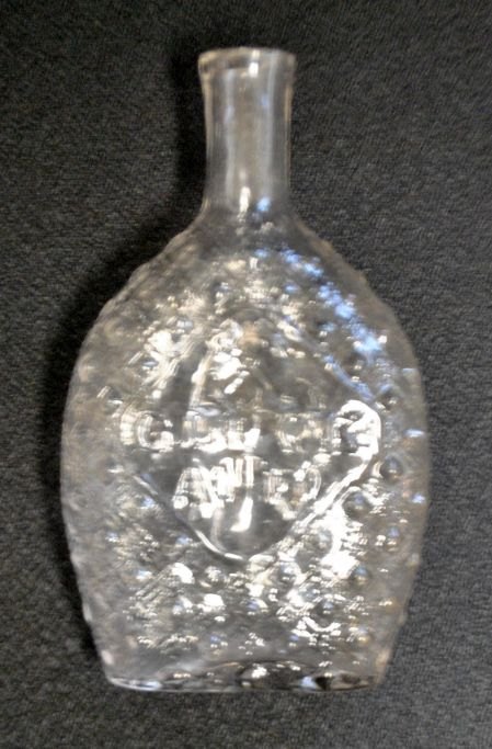 Tysk lommelærke med motiv af minearbejder, 19. årh. Klart glas. Nubret glas. Præget med teksten "Glück Auf!" L: 15,5 cm.Emne nummer: 28685