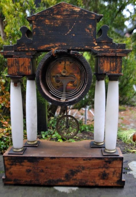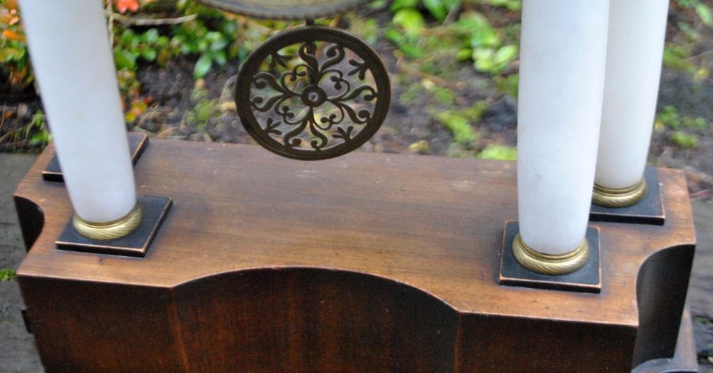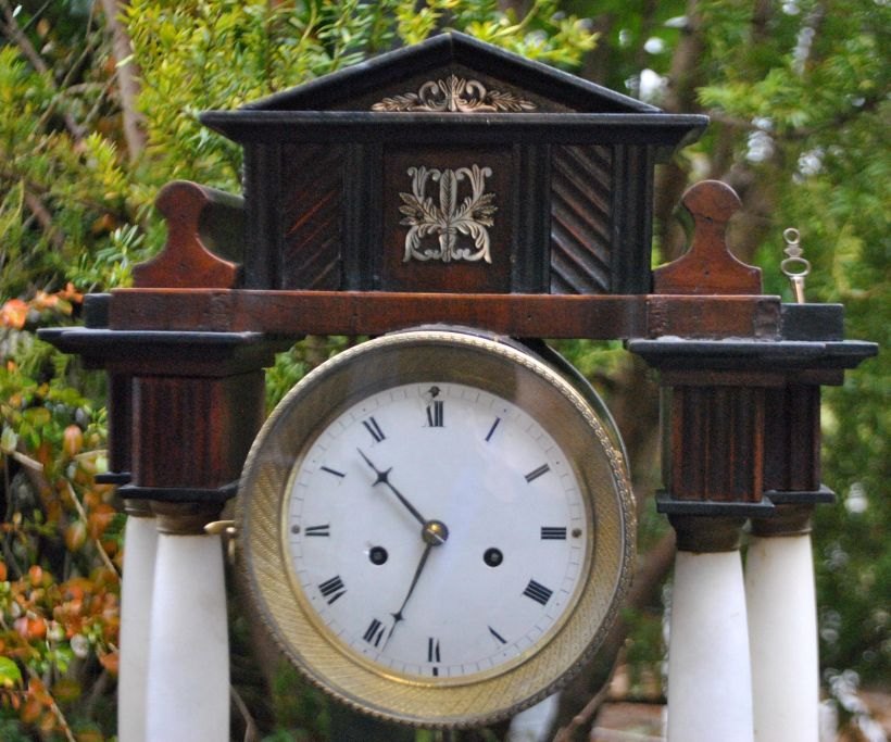 Søjleur i træ, messing og alabast, ca. 1830. Antageligt sydtysk eller østrisk. Mahogni plint og top. Skive i emalje med arabertal. Standart urværk. Urvisere i bronze. H: 45 cm. B: 32 cm.Med to optræksnøgler.