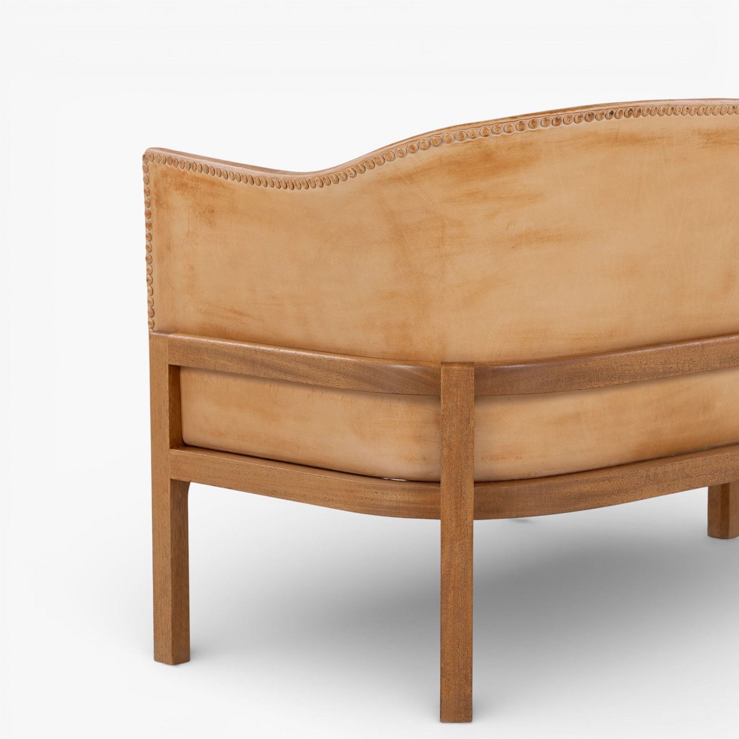 MK 52/2 - 2 pers. sofa i patineret sømbeslået naturlæder med stel i mahogni.