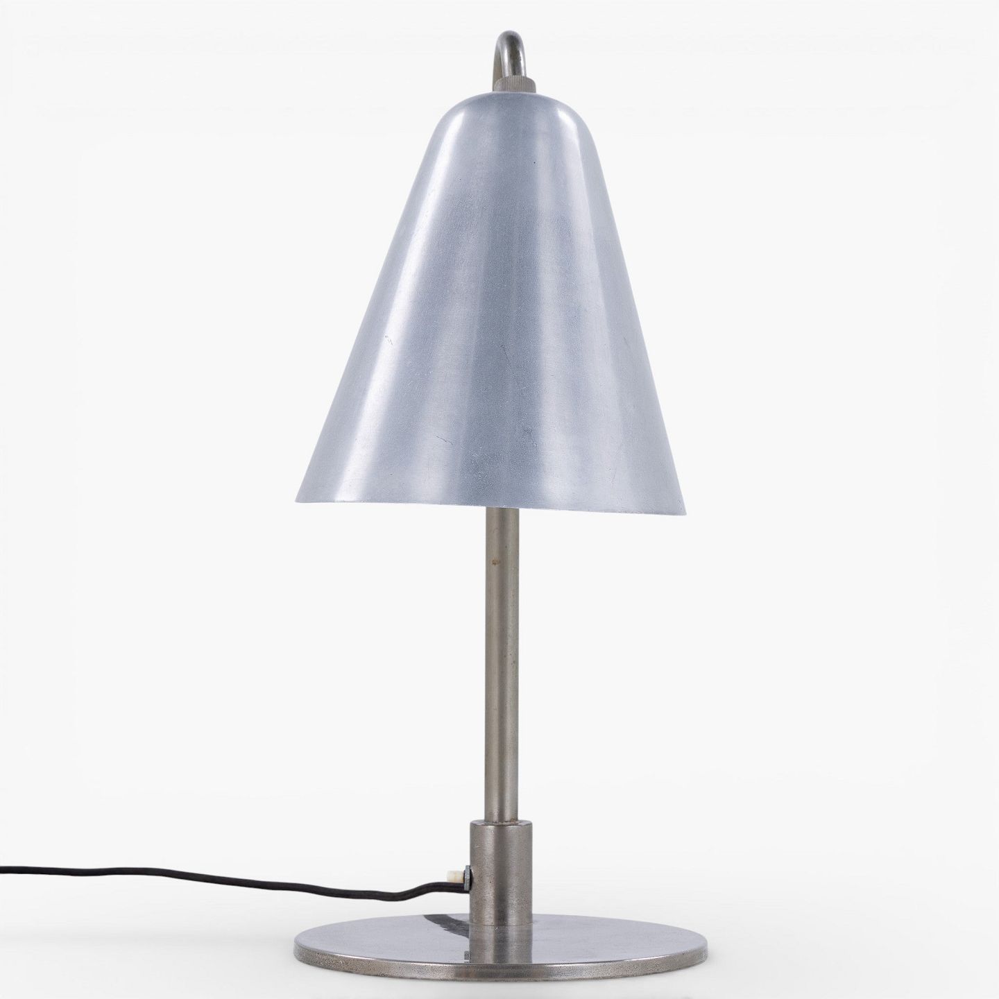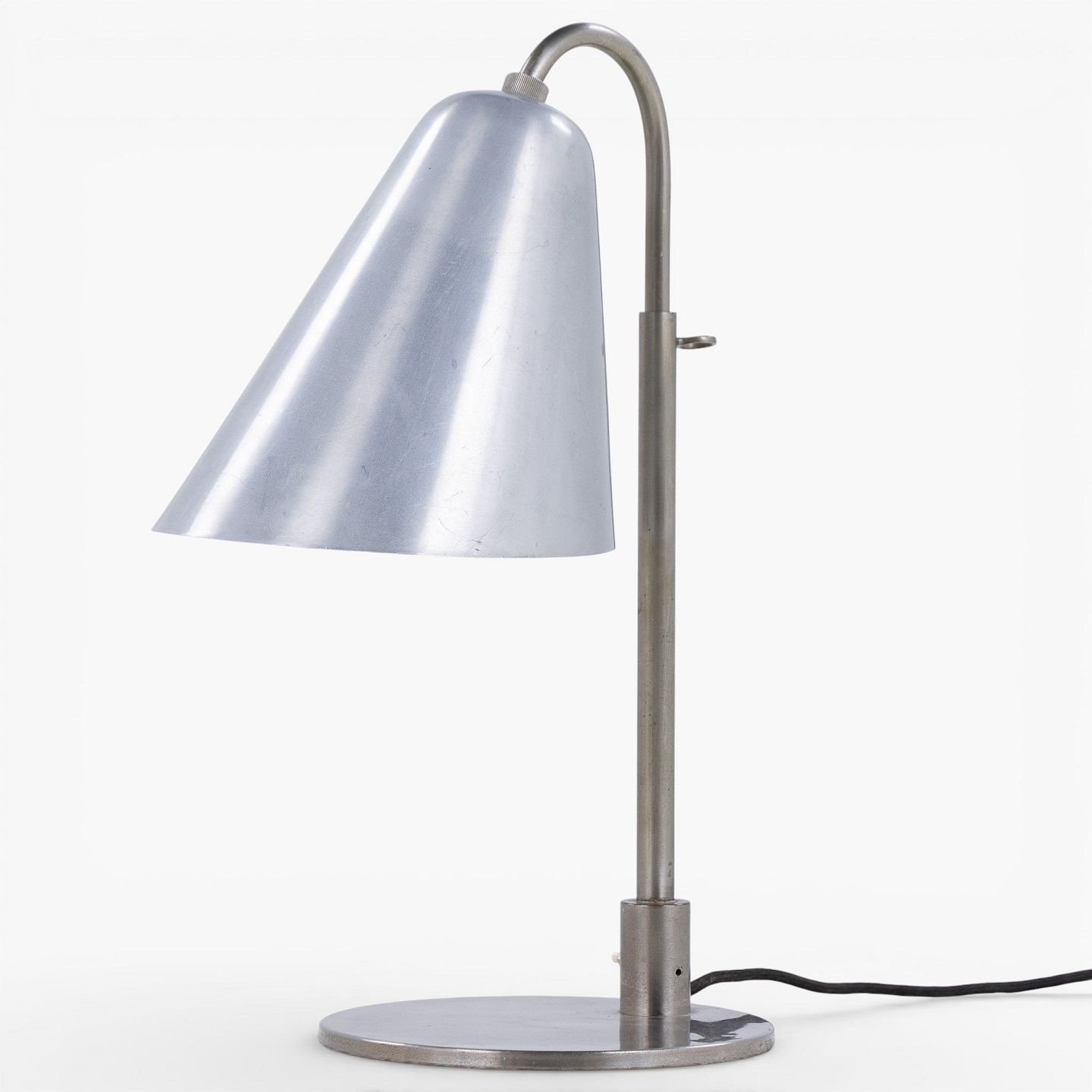 Sjælden bordlampe i forniklet metal med tragtformet skærm. Udført i 1930'erne.