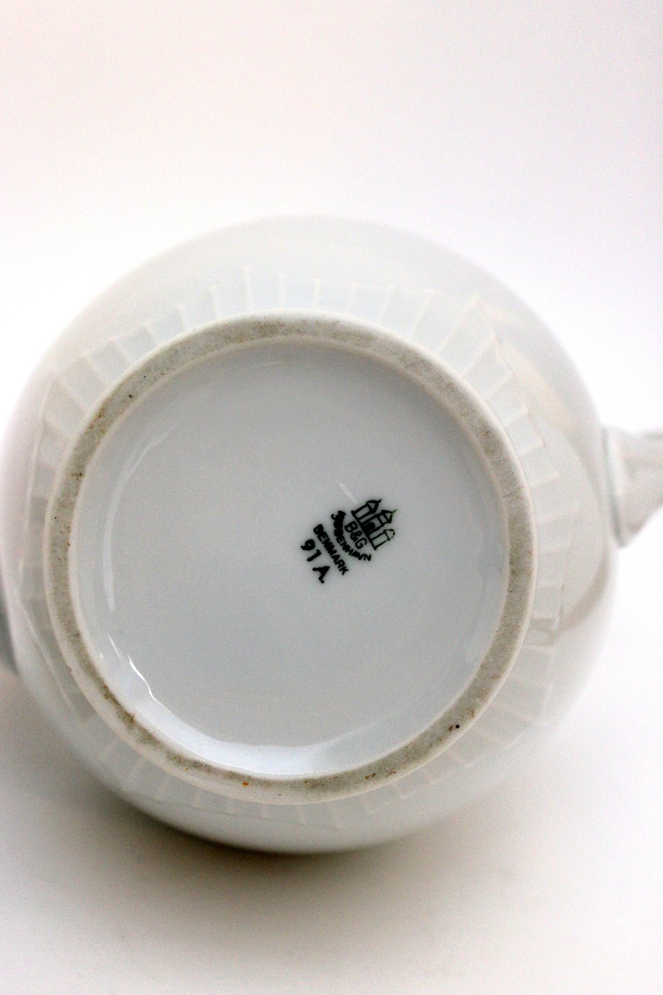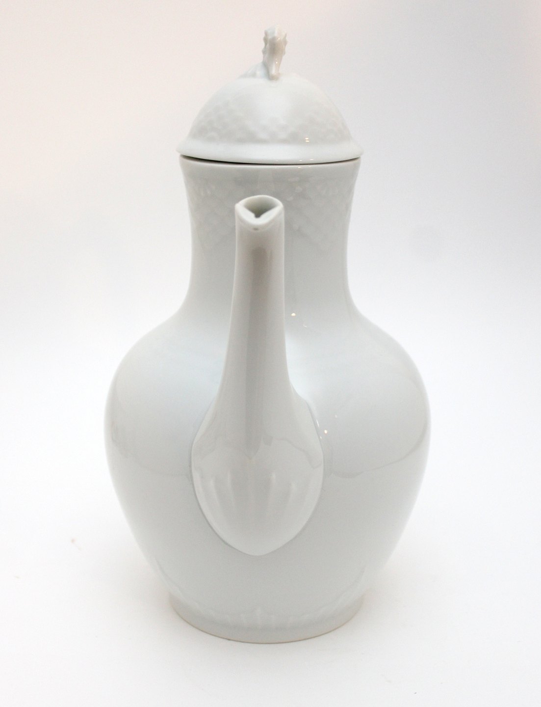 Bing & Grøndahl, Elegance. Kaffekande med låg. Hvidt grundstel med vaflet mønster og søheste. Nr. 91A. Produceret i perioden 1962-1970. Højde 25 cm. Største diameter 12 cm. II. sortering. Fin stand. Pris: 225 kr. stk. Lager: 1 Udstiller