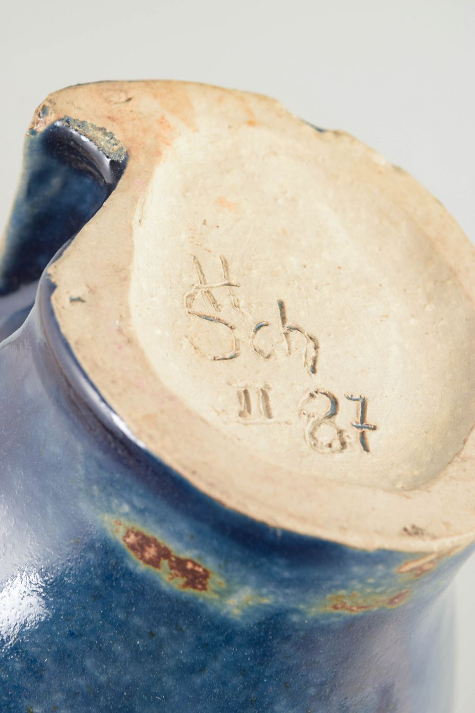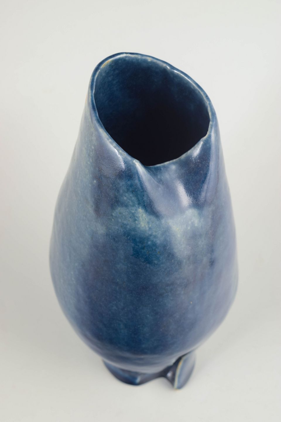 Europæisk studiokeramiker unik vase, 1987.Skulpturelt udformet vase i stentøj med dybblå, let levende glasur og organisk, asymmetrisk åbning. Signeret og dateret 1987.