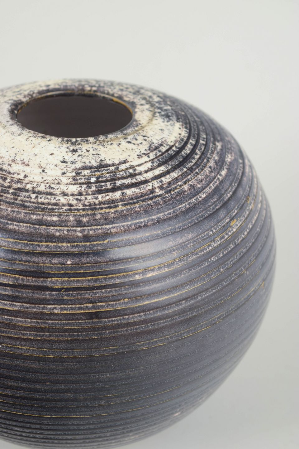 Svend Hammershøi for Kähler vase, 1930’erne.Kugleformet vase i drejet stentøj med karakteristisk rillet overflade og dobbelt glasur i sorte og grå nuancer, der skaber dybde og et nuanceret spil i overfladen.