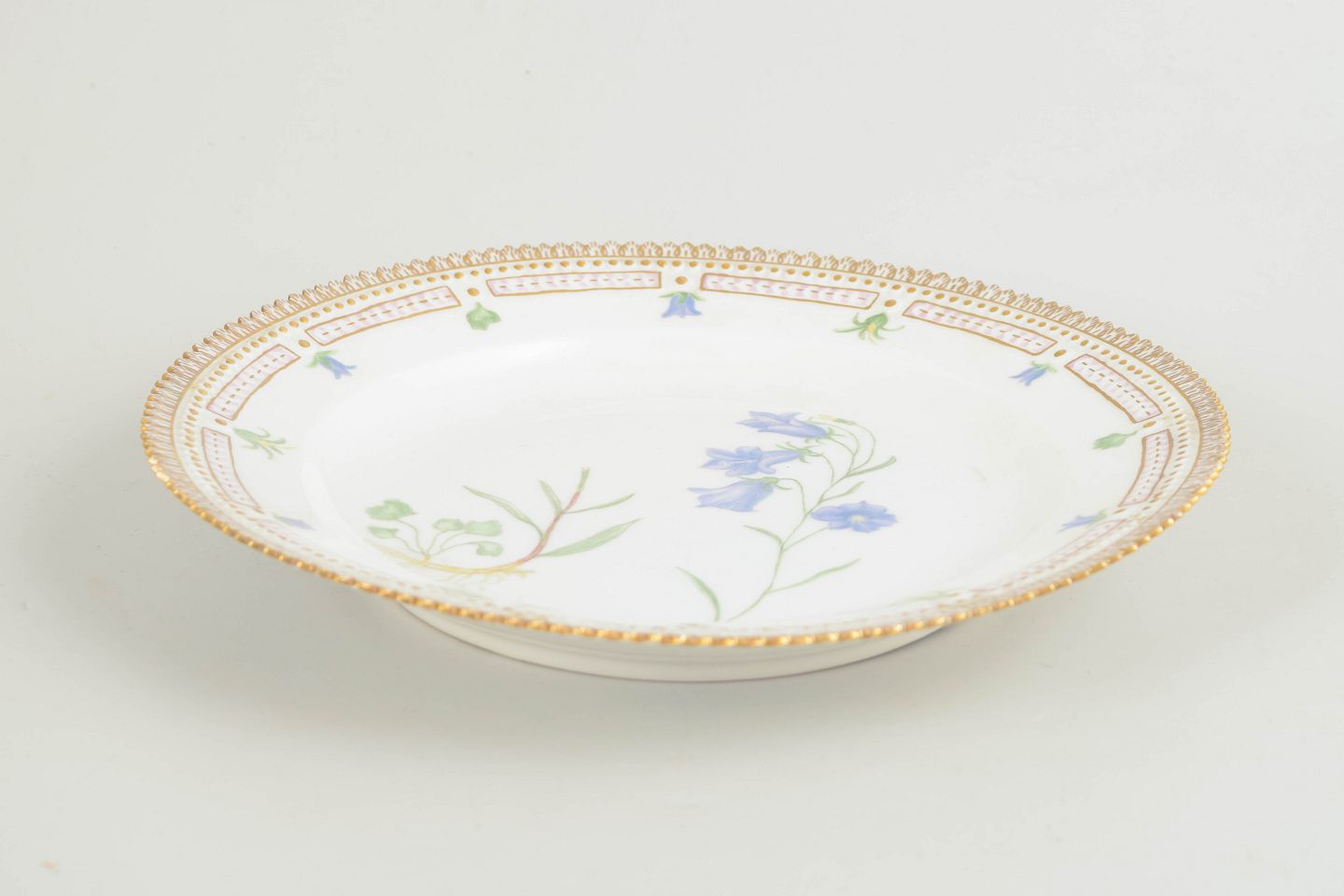 Frokosttallerken i Flora Danica-stellet med håndmalet botanisk dekoration efter originalværker fra Flora Danica-værket. Klassisk form med rigt forgyldt rand.