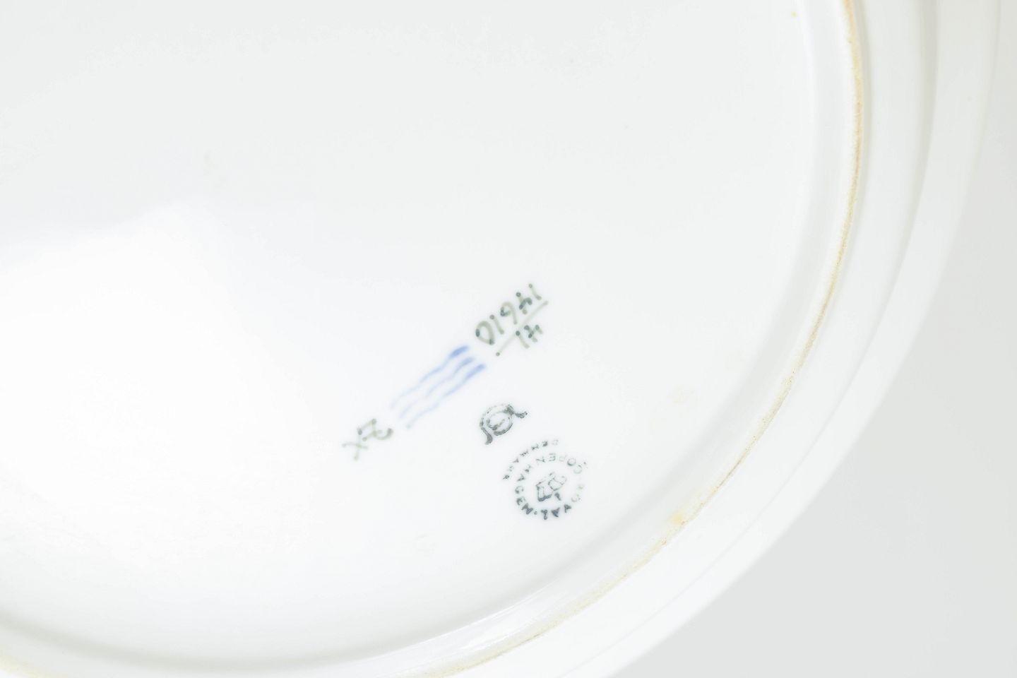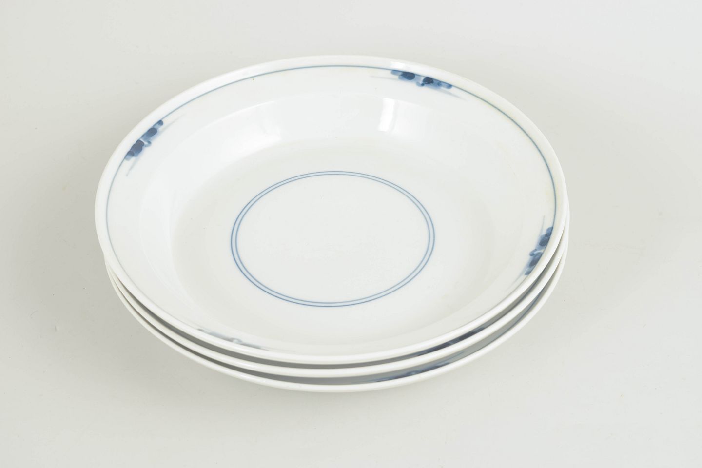 Gertrud Vasegaard for Royal Copenhagen Gemina dybe tallerkener, sæt af 3, 1962.Sæt bestående af tre dybe tallerkener i Gemina-stellet, udført i hvidt porcelæn med diskret, grafisk dekoration i blå underglasur. En stram og moderne formgivning, der er karakteristisk for Royal Copenhagens produktion i 1960’erne.