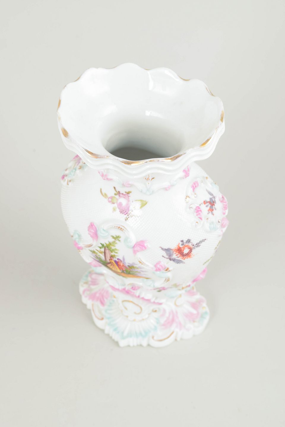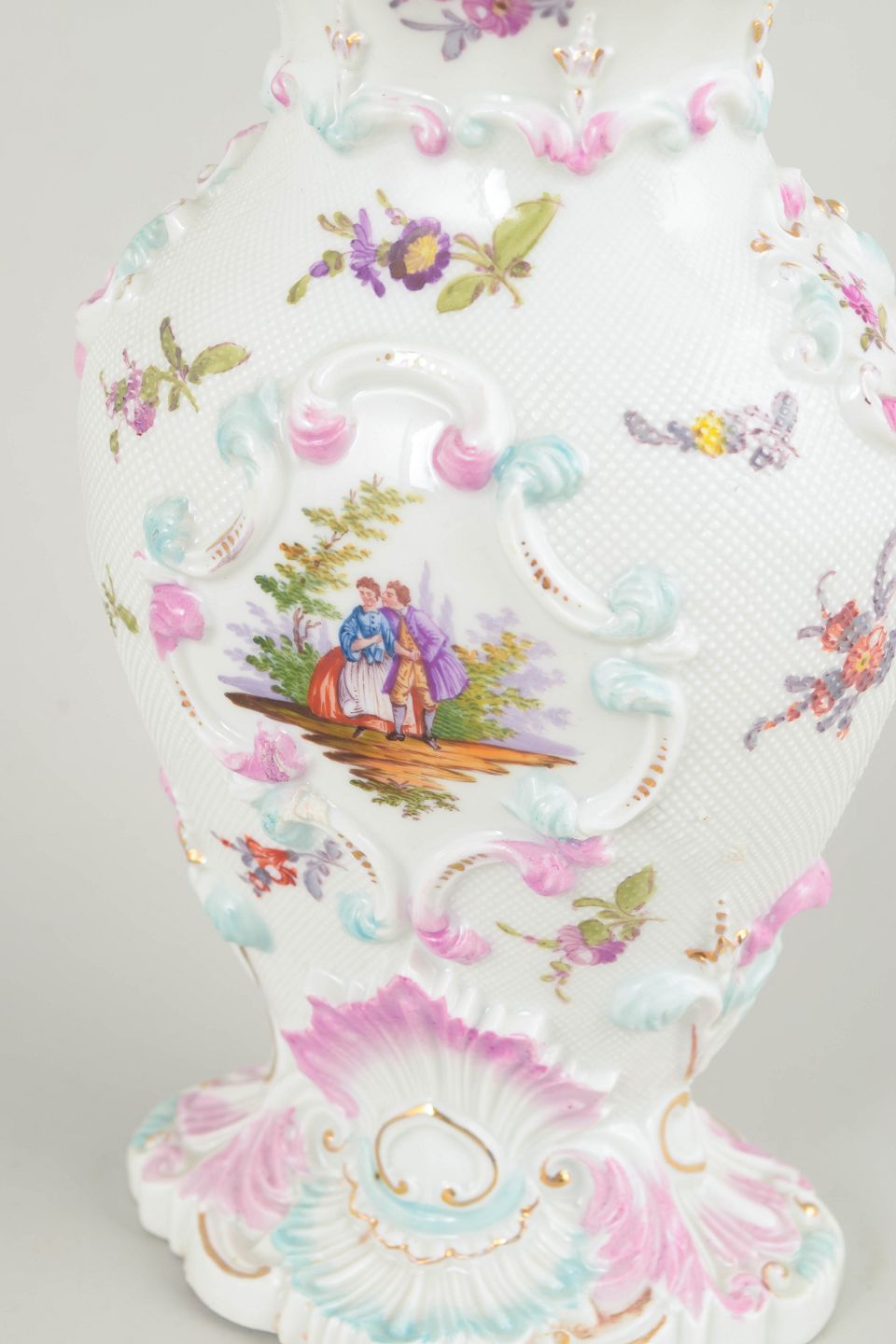 Meissen vase, tidligt 1800-tal.Sjælden vase i hvidt porcelæn rigt dekoreret i relief og med håndmalede polykrome blomster- og landskabsmotiver. Profileret fod og bølget munding. Et fint eksempel på Meissens dekorative porcelænskunst fra det tidlige 19. århundrede.