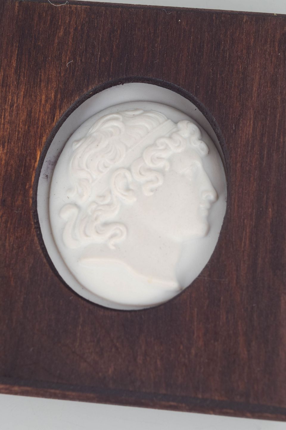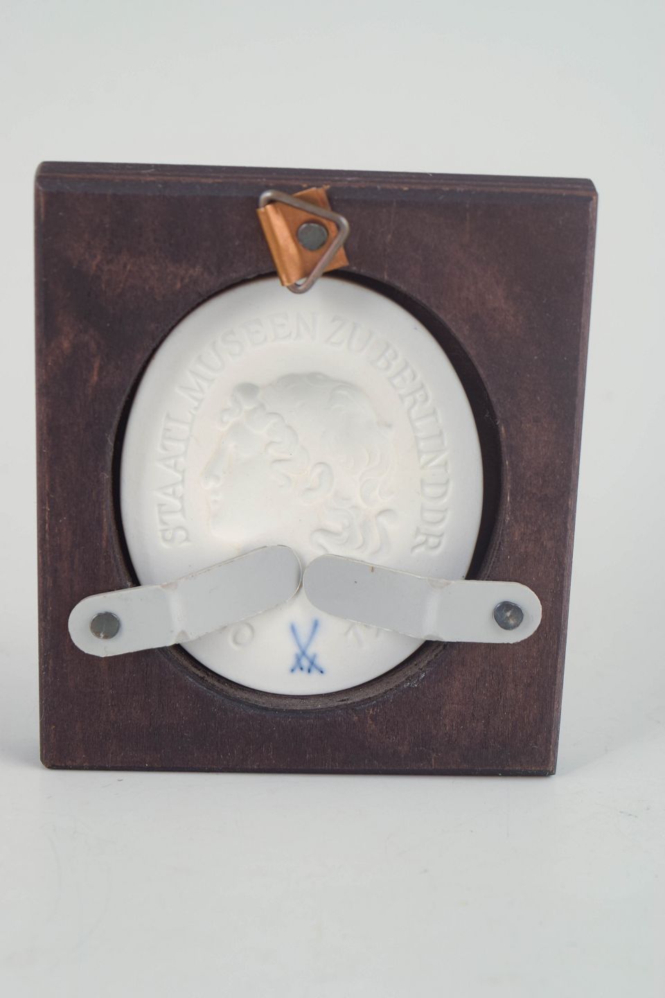 Meissen Biscuit plakette, ca. 1970’erne.Lille reliefplakette i hvid biscuit porcelæn med klassisk profilportræt, monteret i kvadratisk træramme med ovalt udsnit. Den matte biscuit overflade fremhæver de bløde linjer i ansigt og hår og giver et roligt, skulpturelt udtryk.