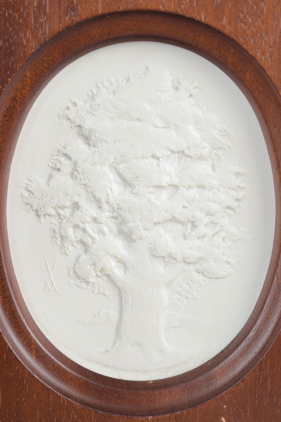 Reliefplakette i hvid biscuitporcelæn med naturalistisk motiv, monteret i rektangulær træramme med ovalt udsnit. Et dekorativt vægobjekt udført i klassisk Meissen-tradition, hvor den matte overflade understreger det plastiske relief.