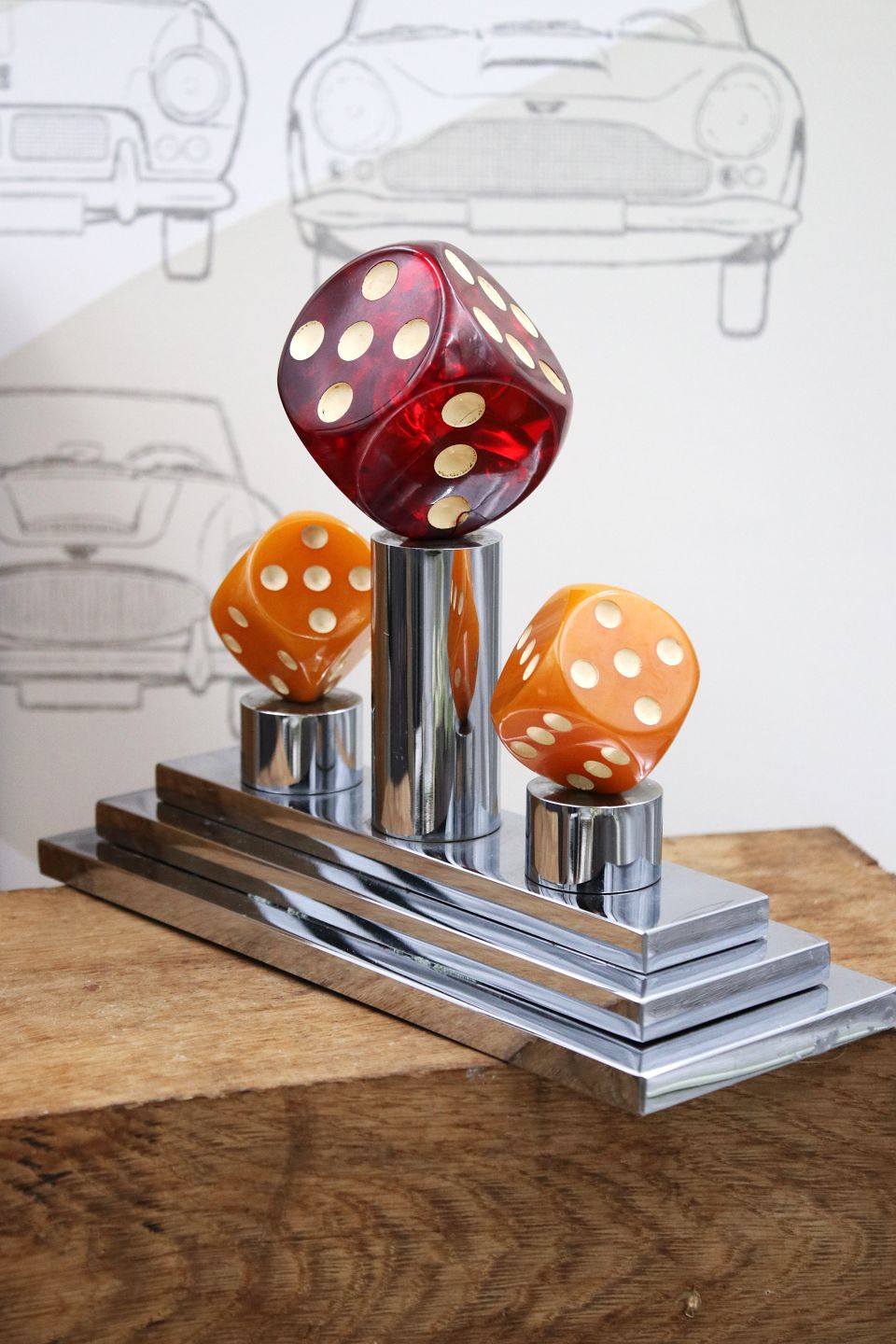 Dekorativ , gammel spille pokal i krom med 3 store terninger i farvet akryl. H: 17cm. L&B: 21x8cm. (Vejer 3,5 kg.)Emne nummer: Spille pokal