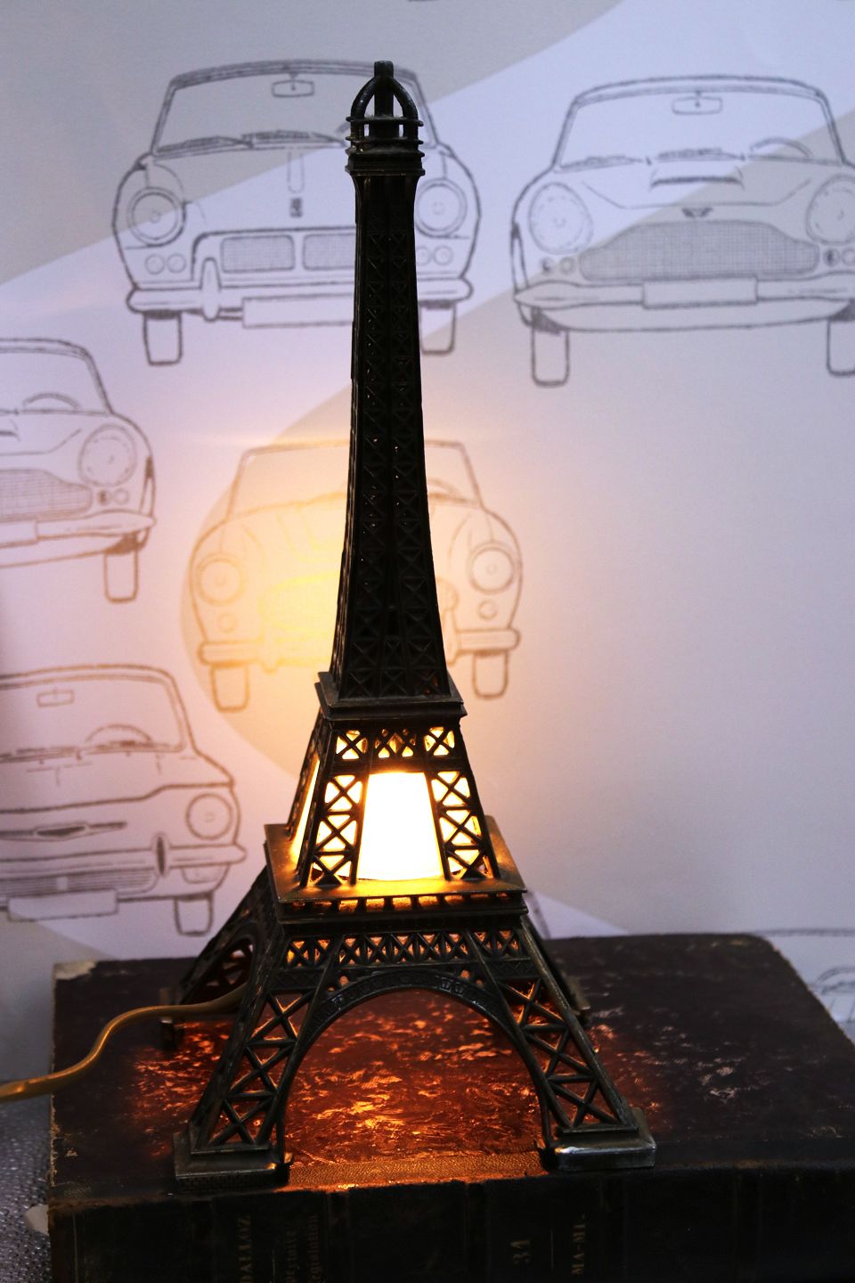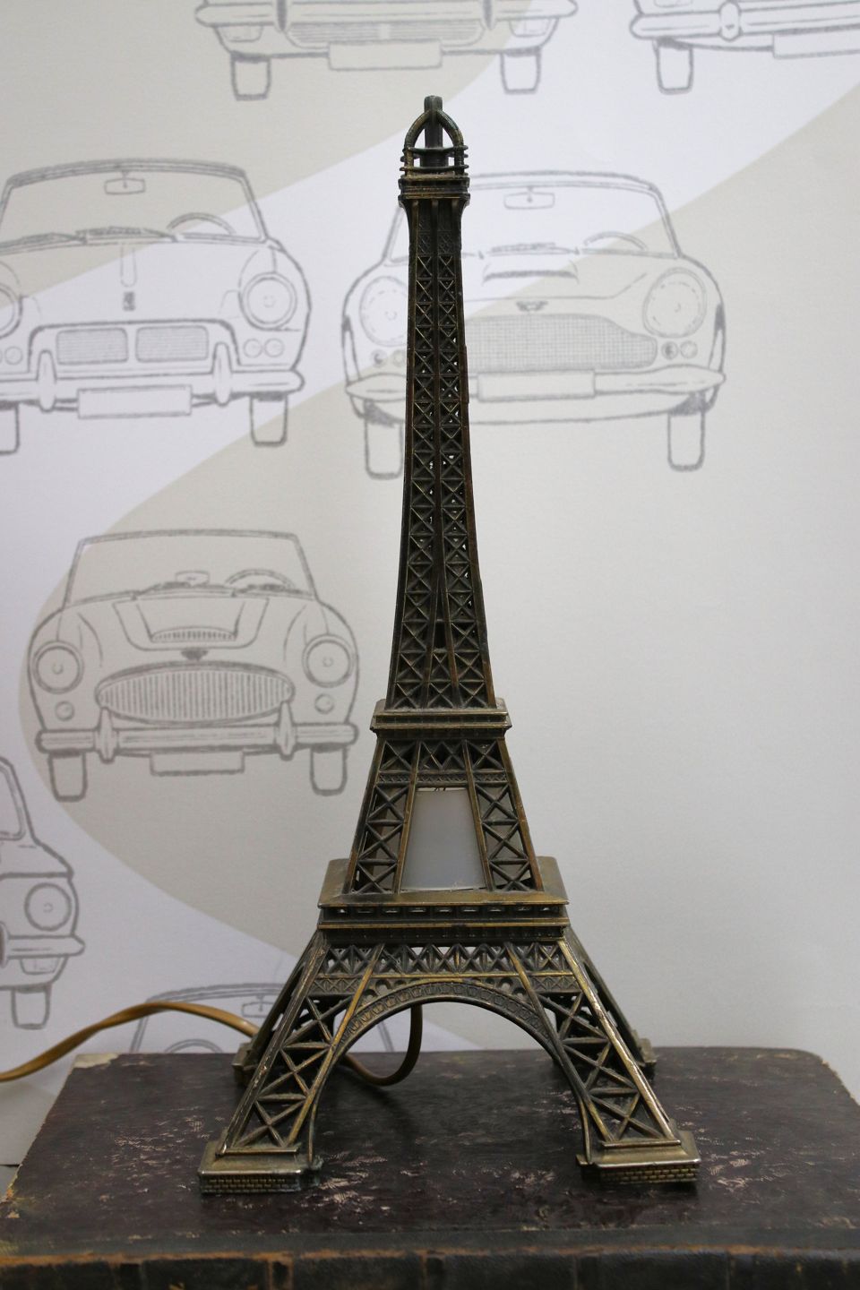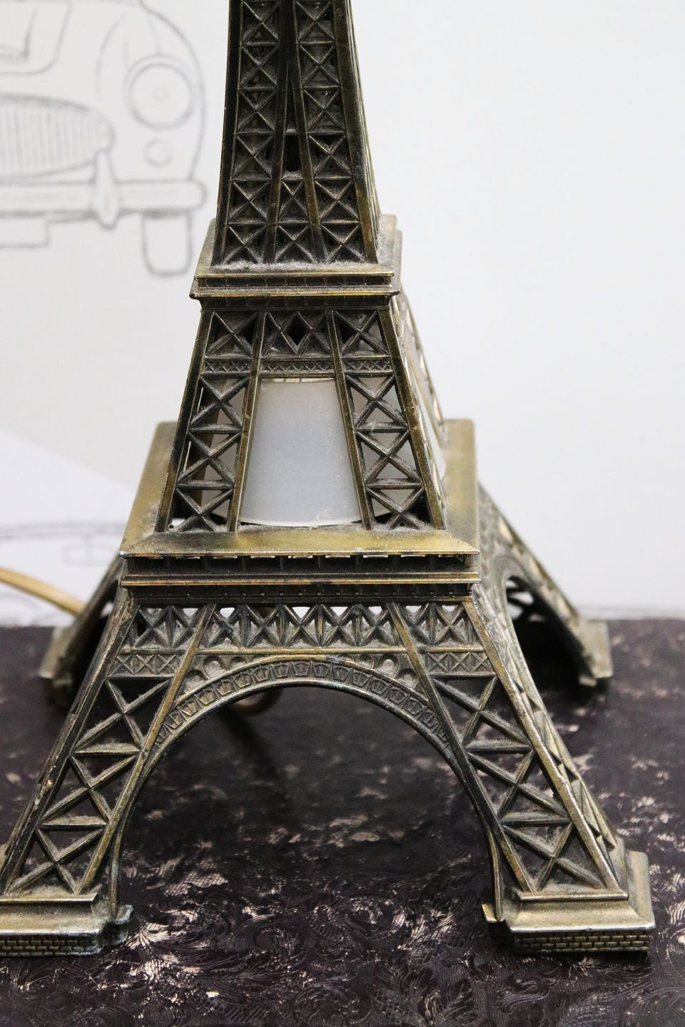 Gammelt miniature Eiffeltårn i metal med lys indeni.H: 35cm. 15x15cm.