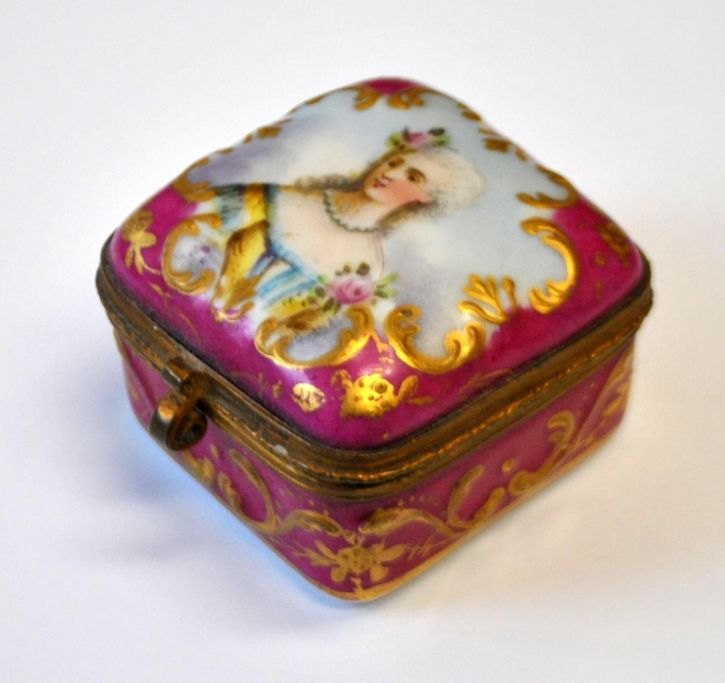 Sevres porcelæns pilleæske, 19. årh. Frankrig. Håndmalet porcelæn med rococo kvinde. Lysrød med rococoforgyldnigner. Indvendig forgyldt. 4,5 x 4,5 x 3 cm. Perfekt stand!Emne nummer: 28719