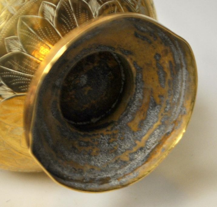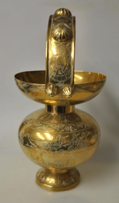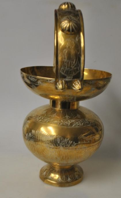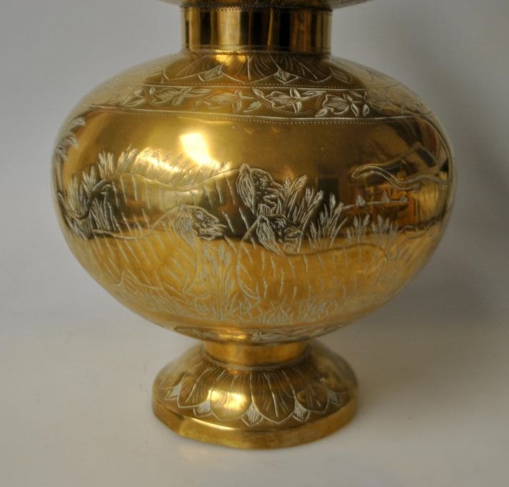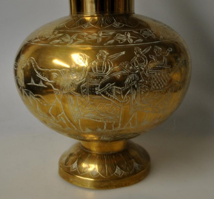 Stor indisk messing vase med hank, ca. 1950. Med indgraverede dekorationer af jagtselskab på elefanter på tiger jagt. På siden ses 4 tigre. Desuden indgraverede blomstermotiver. 32 cm. H.: 21 cm.Emne nummer: 28721