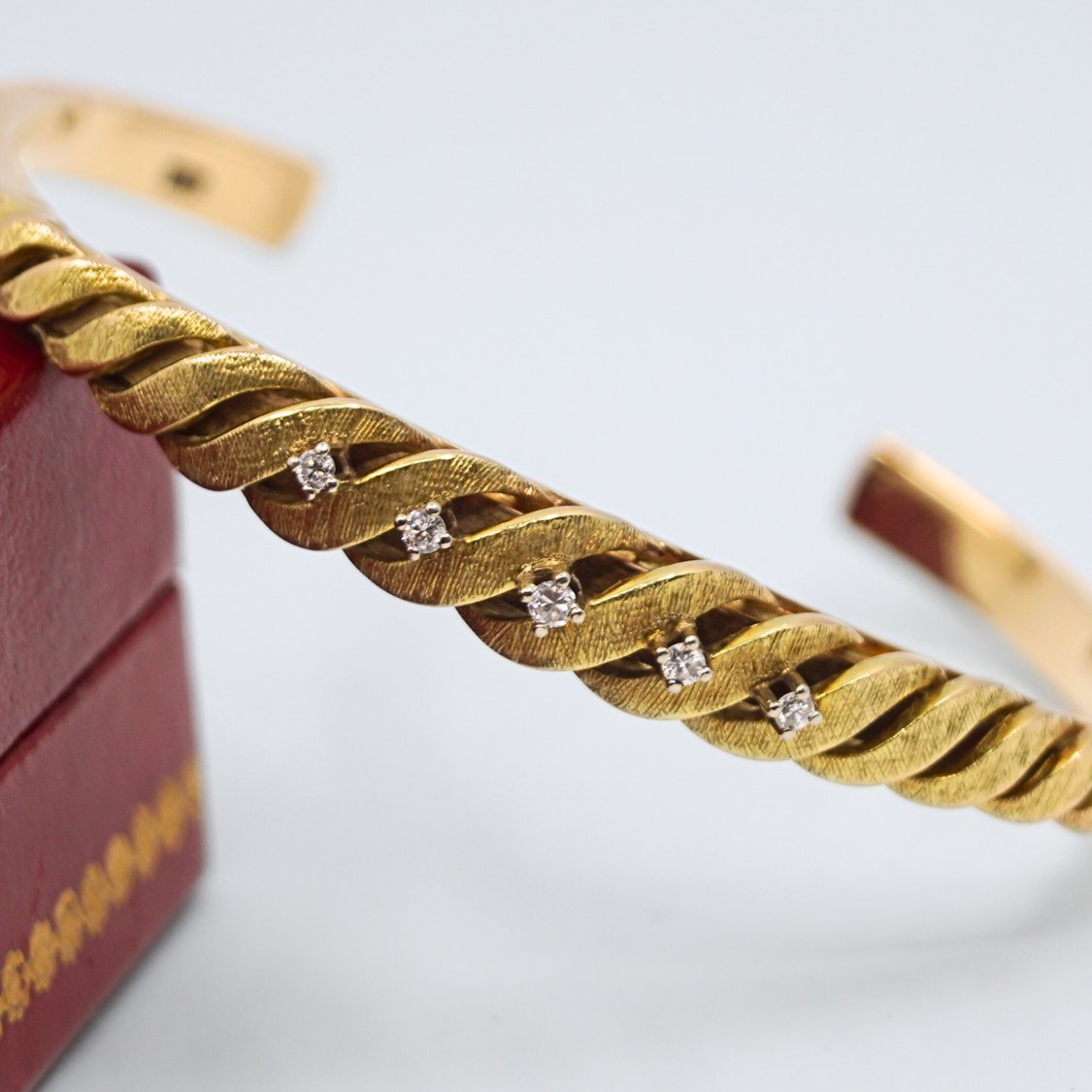 Guldarmring i 14 kt. prydet med fem diamanter, som er fattet i hvidguld. Indvendige mål 5,3 cm x 4,6 cm. B. 5-7 mm. Designet med både glat og materet overflade i guldet. Kraftig kvalitet.Stemplet "585".