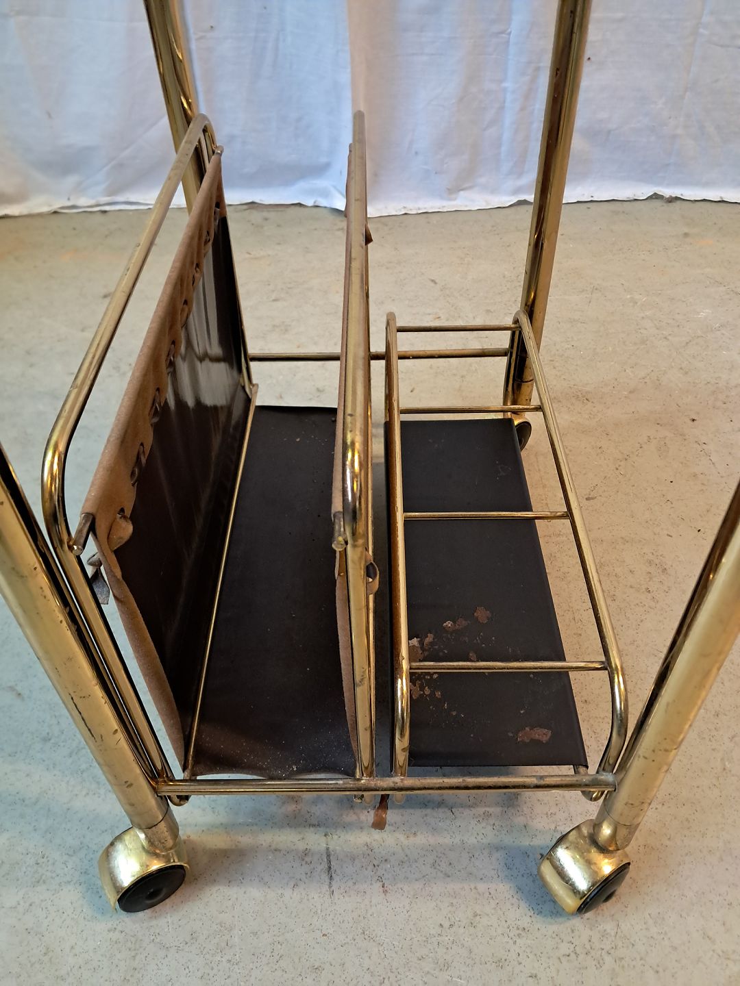 Bord i metal med magasinholder, flaskerum og glasplade, fra 1980erne.Det har brugsspor.