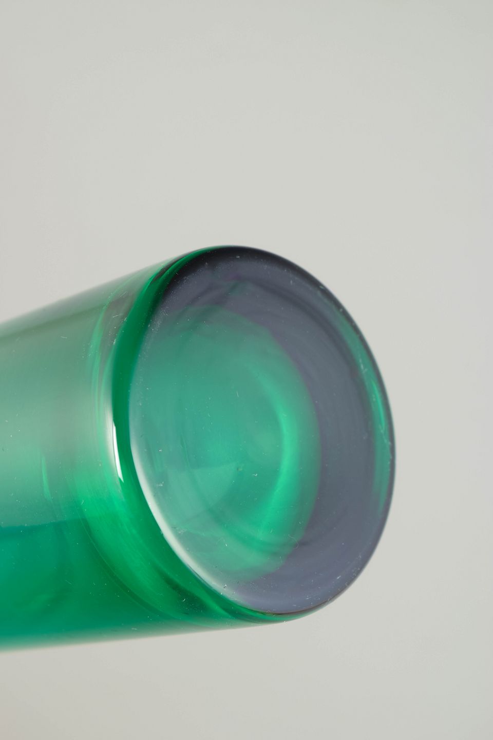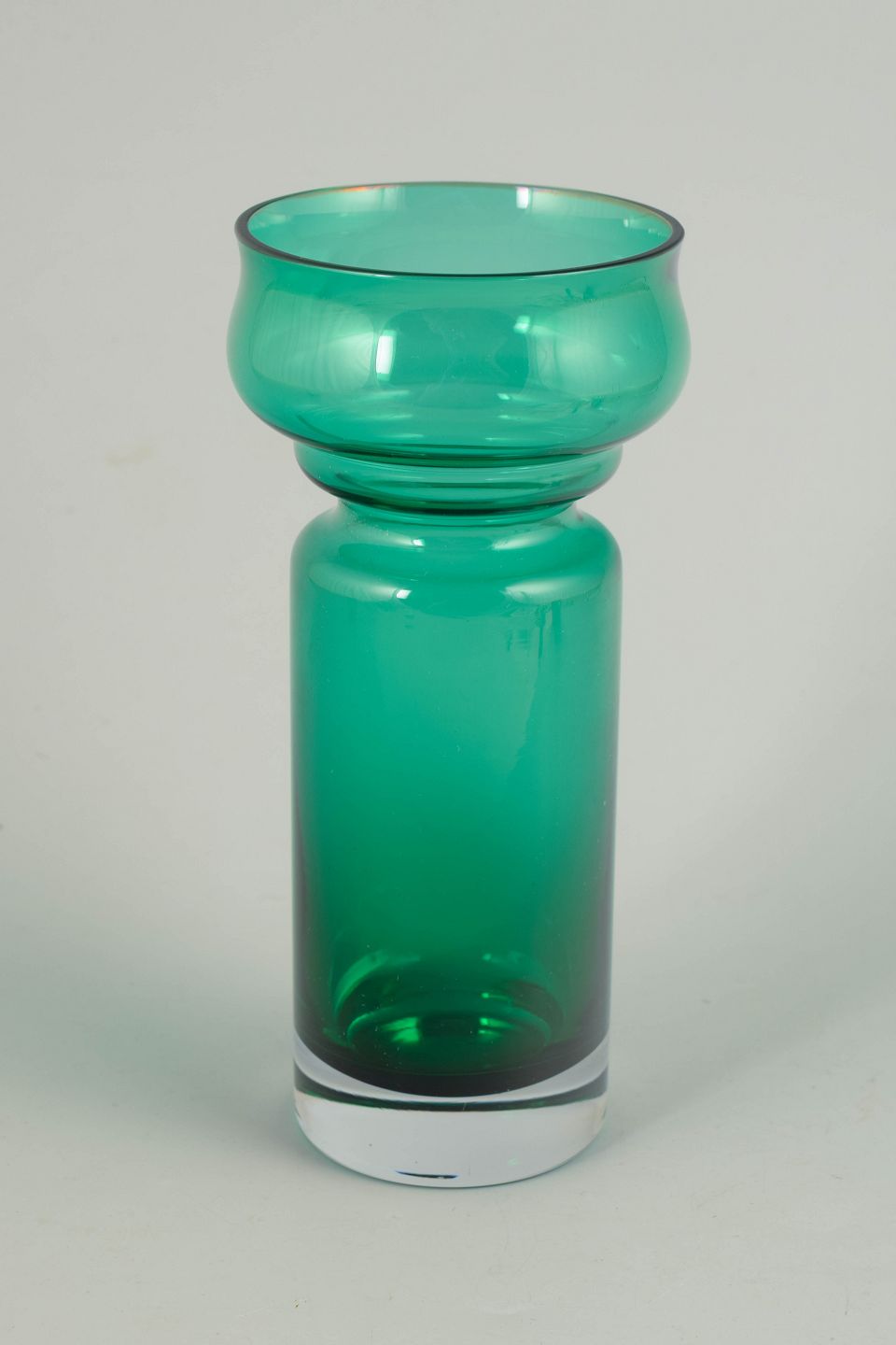 Tamara Aladin for Riihimäen Lasi, mundblæst kunstglasvase.Elegant vase i klart turkisgrønt glas med balanceret, skulpturel profil og blød, rundet form. Mundblæst udførelse med markeret skålformet overdel og cylindrisk underdel, typisk for finsk kunstglas fra 1970’erne.