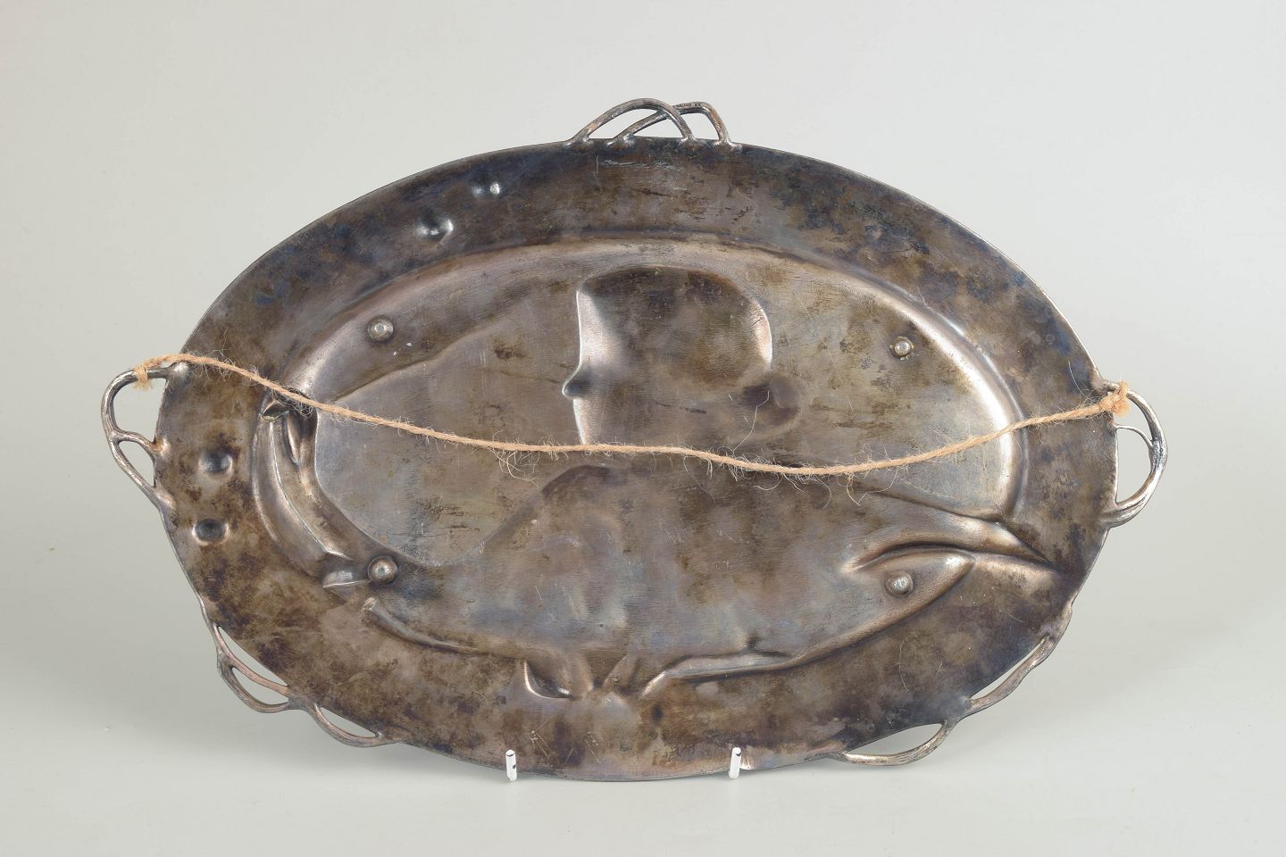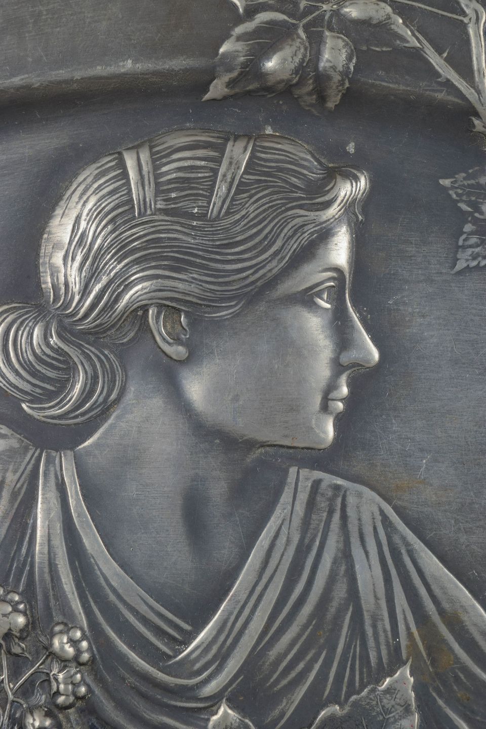 WMF, Tyskland, stort Art Nouveau vægrelief.Stort ovalt fad i sølvfarvet metal med reliefdekoration i klassisk jugendstil, forestillende en kvindefigur omgivet af slyngende blomster og blade. Elegant, skulpturel komposition med fine detaljer og blød linjeføring, karakteristisk for WMF’s produktion i perioden. Kan anvendes både som serveringsfad og som vægophæng. Signatur forekommer, men er ikke tydeligt læsbar.