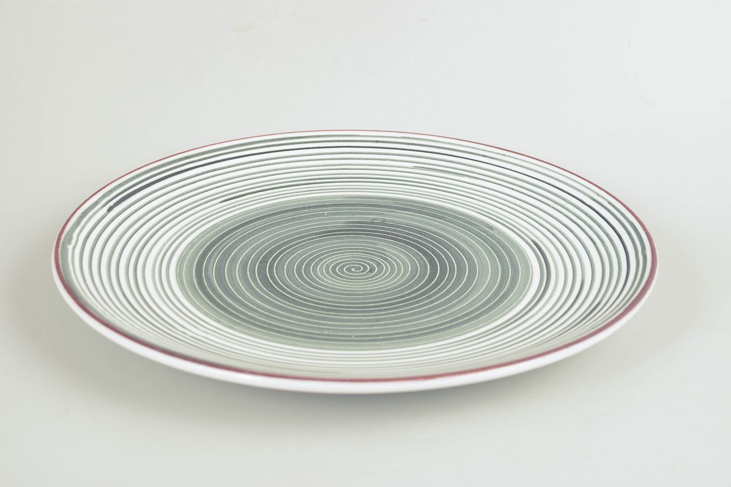 Hjördis Oldfors for Upsala-Ekeby, fad.Dekorativt fad i glaseret keramik med grafisk spiralornamentik i grågrønne nuancer og rød kant. Modellen fremstår med et stramt, tidstypisk formsprog fra 1930/40’ernes svenske modernisme og er angivet som model 53.