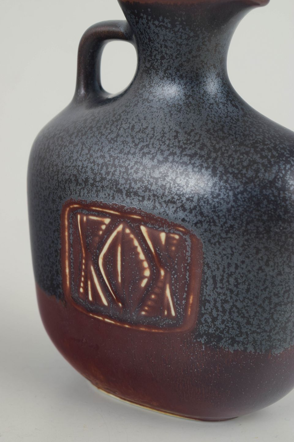 Gunnar Nylund for Rörstrand, kande.Kompakt og velafbalanceret kande i stentøj med afrundet, skulpturel form. Udført med karakteristisk mørk, fint spættet glasur i grålige og brunrøde nuancer, med integreret hank og let udadbøjet hældetud. Et klassisk eksempel på Gunnar Nylunds sikre proportionering og materialefølelse hos Rörstrand i midten af det 20. århundrede.
