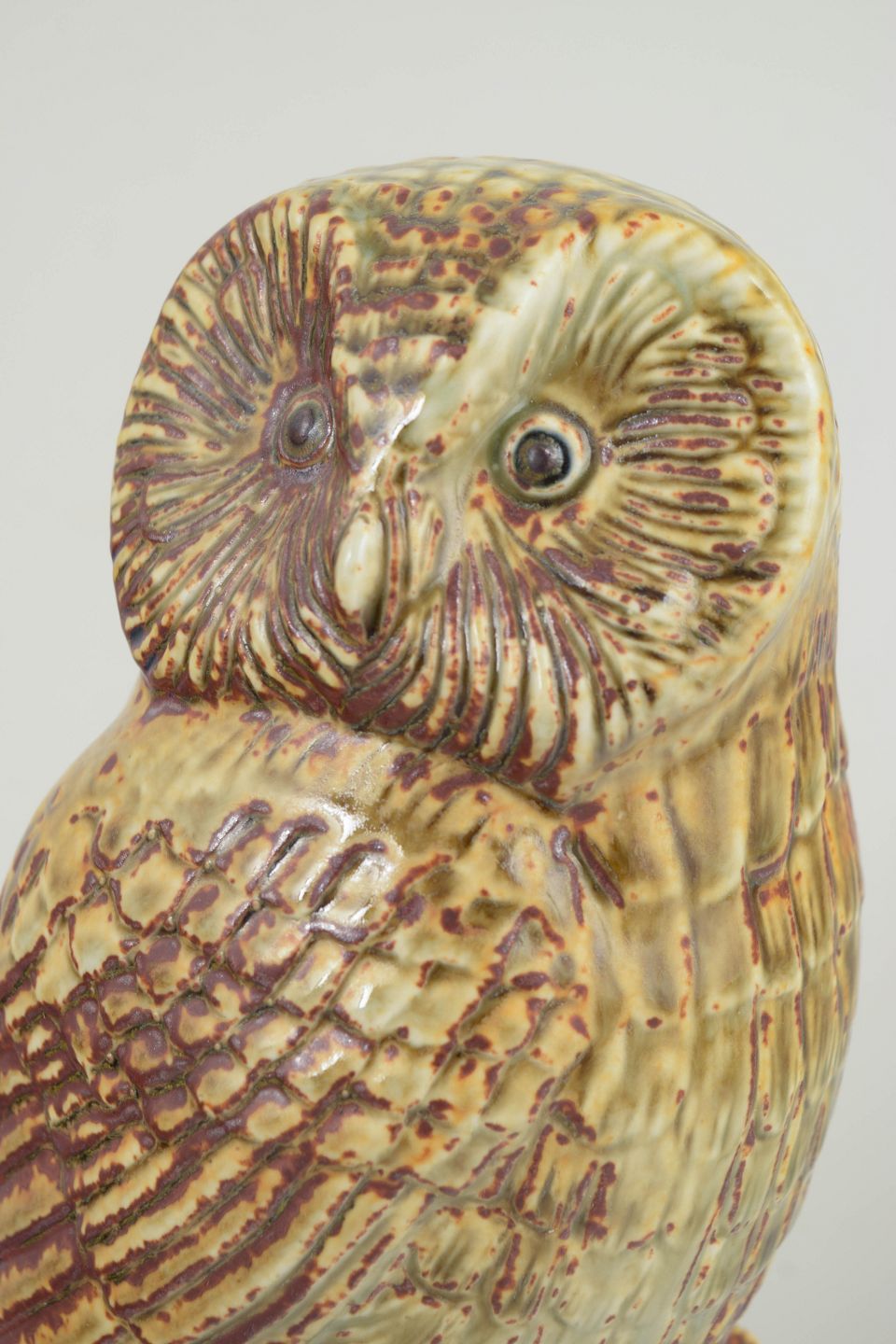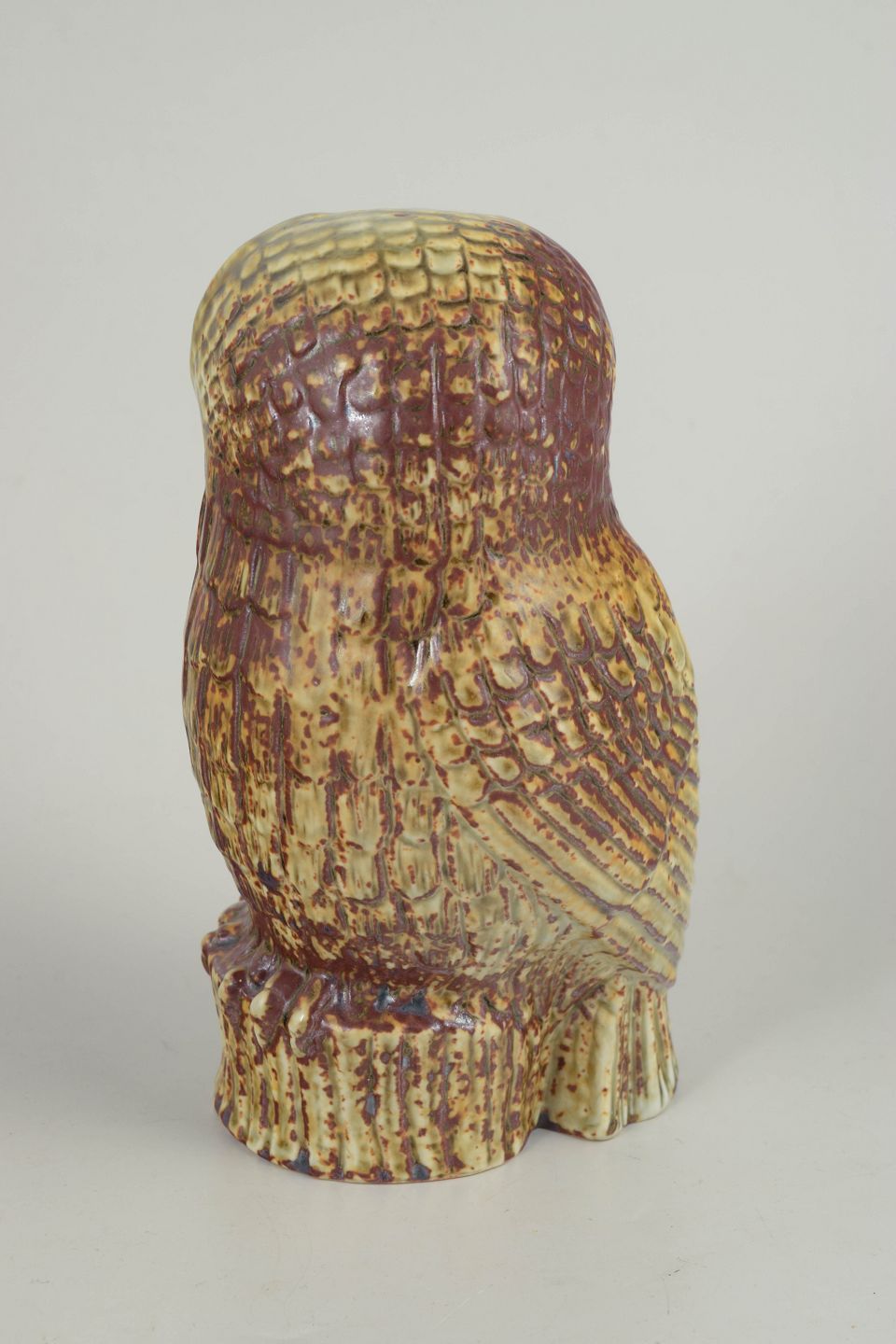 Sven Wejsfelt for Gustavsberg, uglefigur.Naturalistisk uglefigur i stentøj med detaljeret relief og levende, flerfarvet glasur i jordnære nuancer. En karakterfuld skulpturel form med tydelig reference til naturmotiver, udført i et robust og dekorativt udtryk.
