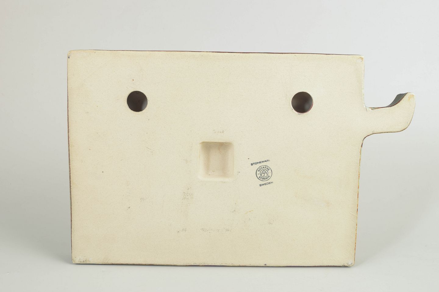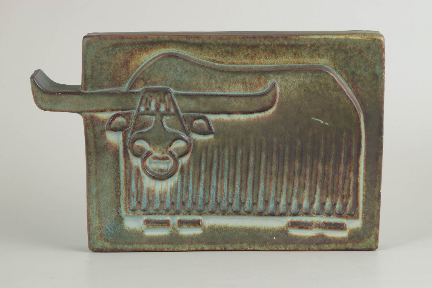Andersson & Johansson for Höganäs, vægrelief.Relief i stentøj med stiliseret dyremotiv i lavt relief, udført i karakteristisk nordisk formsprog. Glasur i dæmpede jordtoner med grønne og brune nuancer, typisk for Höganäs’ produktion i perioden.