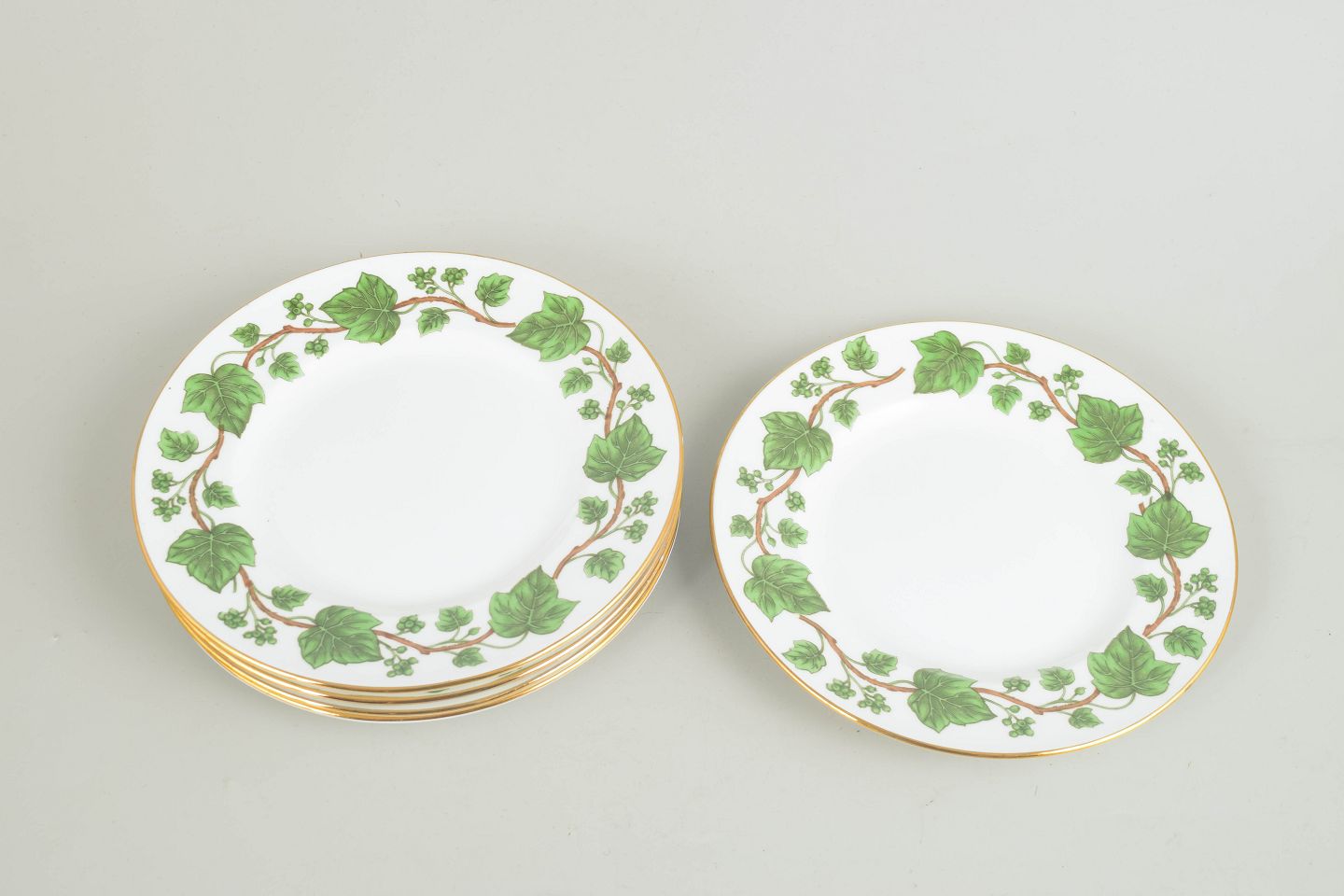 Staffordshire, England, Ivy serien, sæt med fem tallerkener.Dekorative fajancetallerkener med grøn vedbend dekoration og guldkant, produceret i Staffordshire, England.