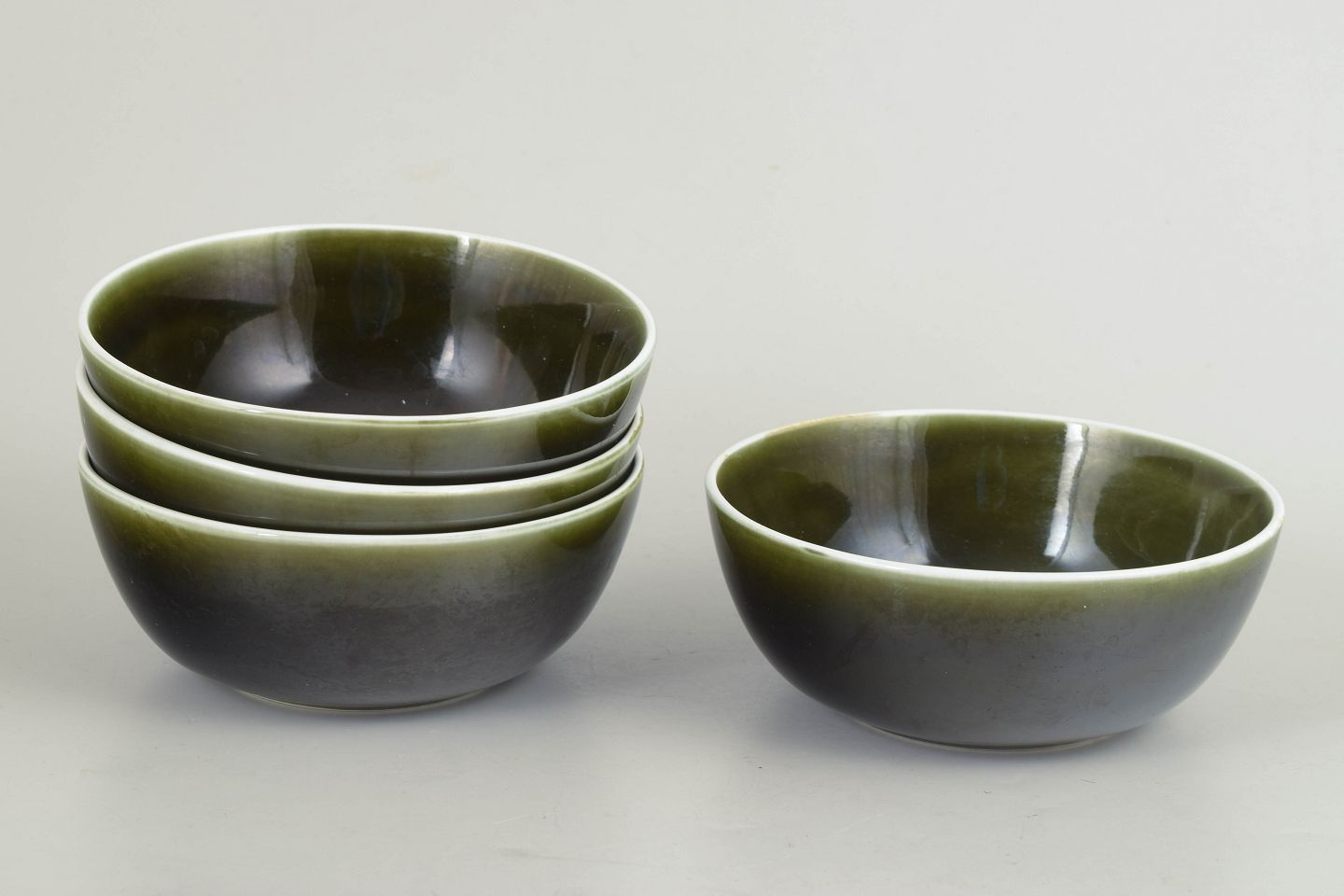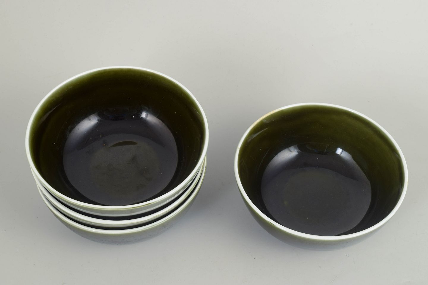 Stig Lindberg for Gustavsberg, Vardag-serien, sæt af fire skåle.Sæt bestående af fire skåle i stentøj fra Vardag-serien med karakteristisk grøn glasur. Enkle og funktionelle former designet til hverdagsbrug, med et roligt og tidløst skandinavisk modernistisk udtryk.