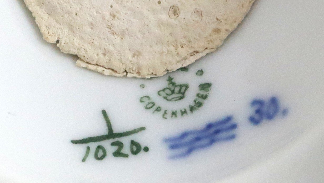 Royal Copenhagen. Musselmalet, helblonde. Kageskål på fod. Model 1020. Højde 14,5 cm. Diameter 20,5 cm. Produceret før 1923. (1 sortering) Udstiller