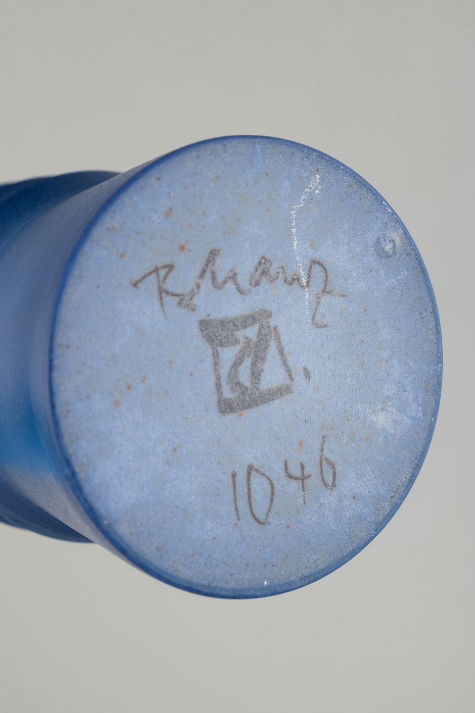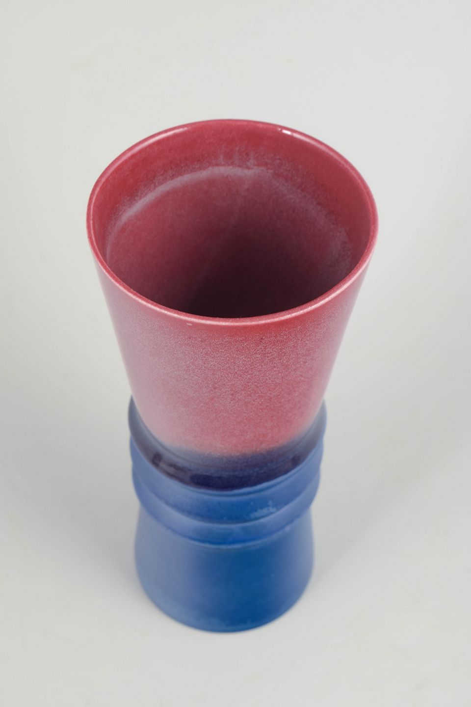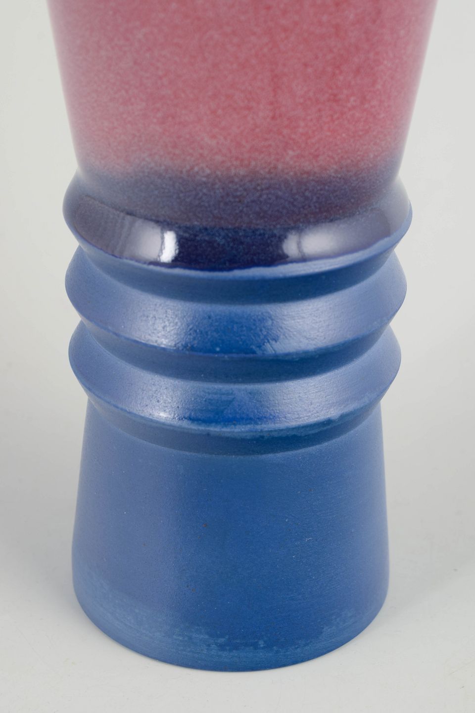 Richard Manz, unika vase.Skulpturelt formet vase i drejet stentøj med markant silhuet. Udført med blank glasur i dybe blå nuancer nederst og rødviolet overgang øverst, typisk for eksperimenterende skandinavisk studiokeramik fra 1960’erne. Det trinvise midterparti giver et arkitektonisk og modernistisk udtryk.