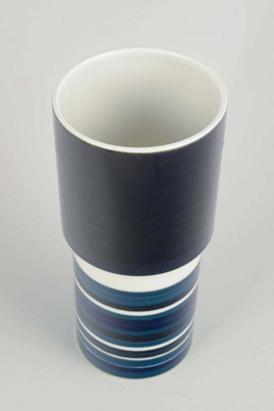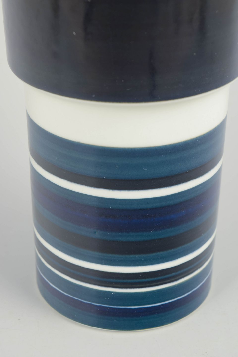 Arabia, unika vase.Høj, cylindrisk vase i glaseret stentøj med grafisk feltinddeling, bestående af en dyb, mørk glasur i den øvre del og horisontale striber i blå, grå og hvide nuancer nederst. Modellen er signeret GS/PR.