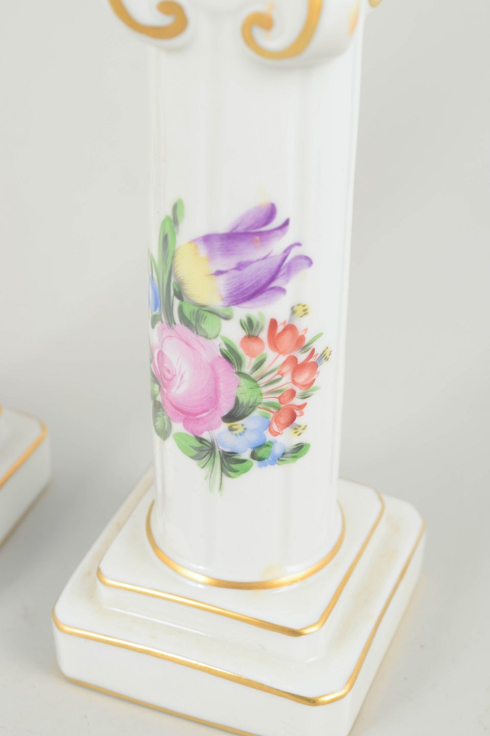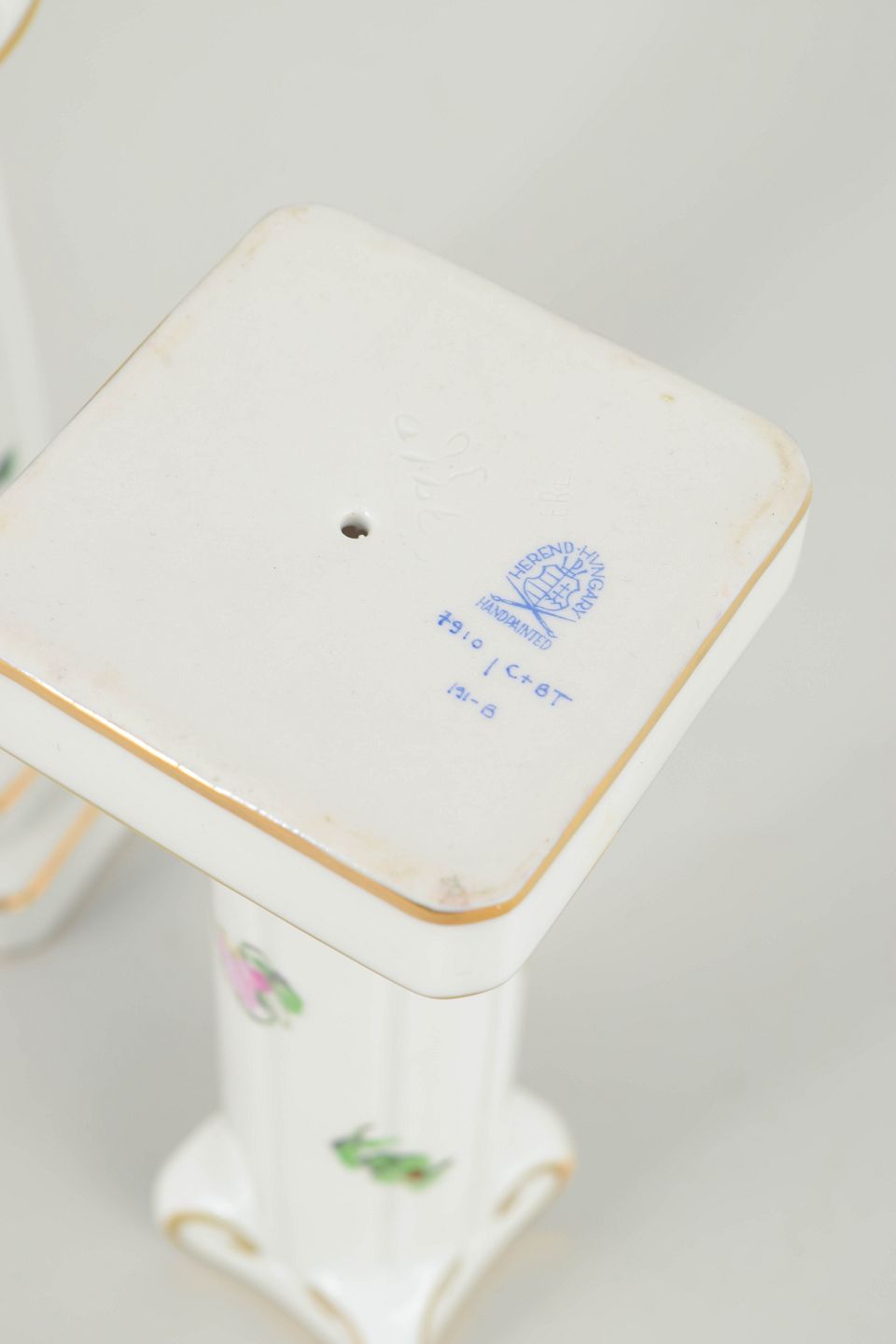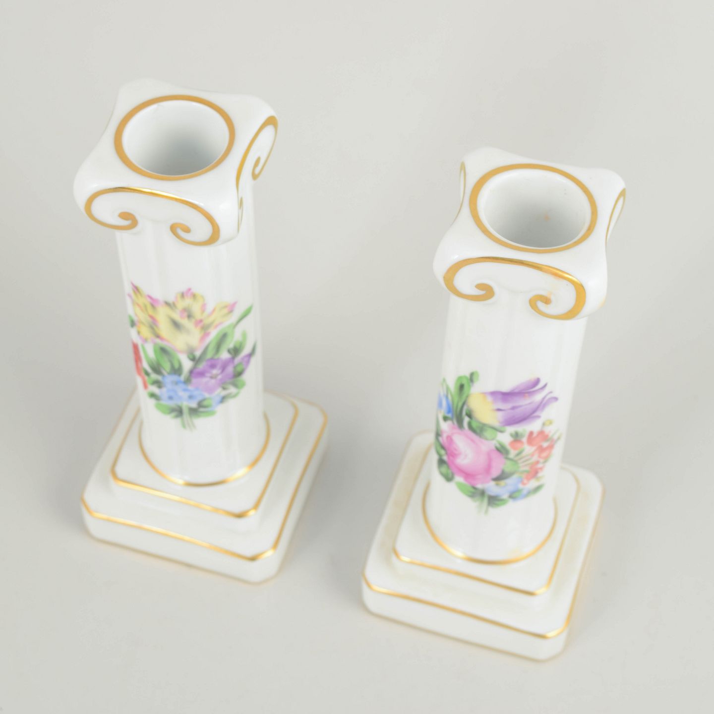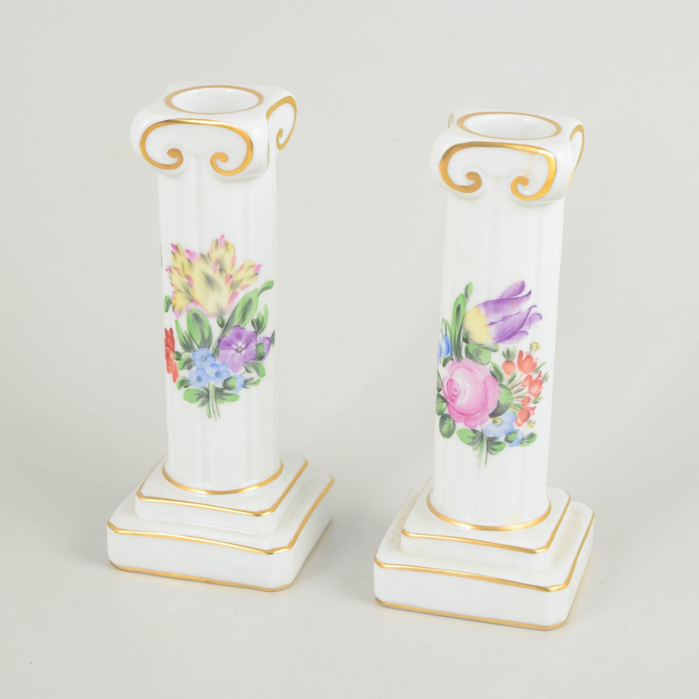 Herend, par lysestager.Håndmalet par lysestager i glaseret porcelæn med blomsterdekorationer i rosa, lilla, blå og grønne nuancer. Slanke, balusterformede søjler på kvadratiske fødder med profilerede detaljer og diskret forgyldning langs kanter og ornamentik. Hver stage er individuelt dekoreret med varierende blomstersammensætninger.