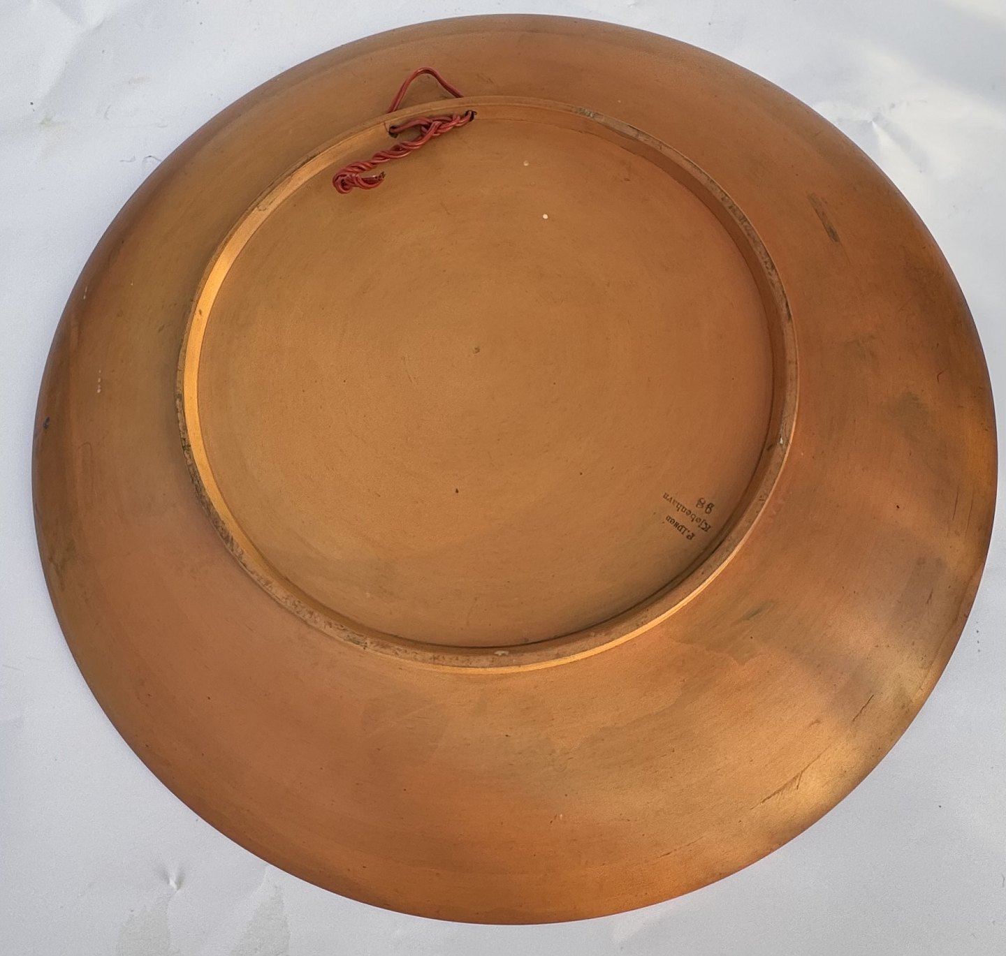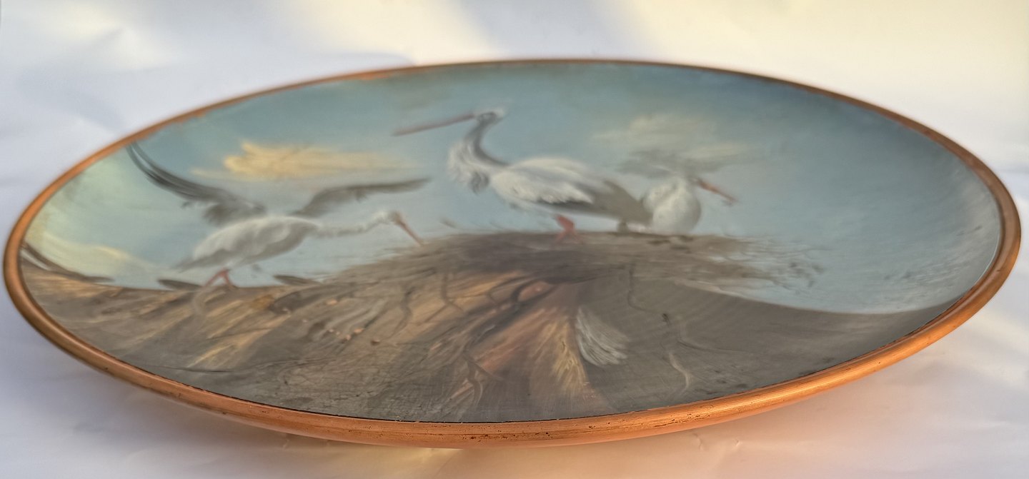 Meget stor platte terracotta fra Peter Ipsen, Kjøbenhavn fra omkring 1900. Bemalet med tre storke ved storkerede. Lidt overflade brugsspor. Ingen skader eller reparationer. Fabriksmærket på bagsiden. Mål: H. 4 cm Ø. 37 cmv/ Jesper Reutemann